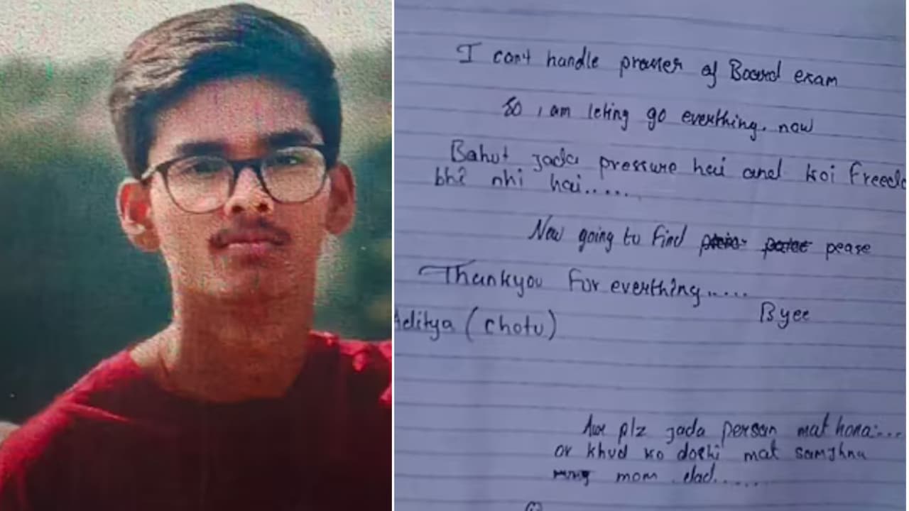 पुलिस को आदित्य की जेब से एक सुसाइड नोट मिला है। इसमें उसने बोर्ड परीक्षा के दबाव का जिक्र करते हुए लिखा है कि वह तनाव में है और इसी वजह से यह कदम उठा रहा है। यह पढ़कर परिजन टूट गए। परिवार का कहना है कि आदित्य पढ़ाई में सामान्य था और उसने कभी किसी बड़ी परेशानी की बात नहीं कही थी।