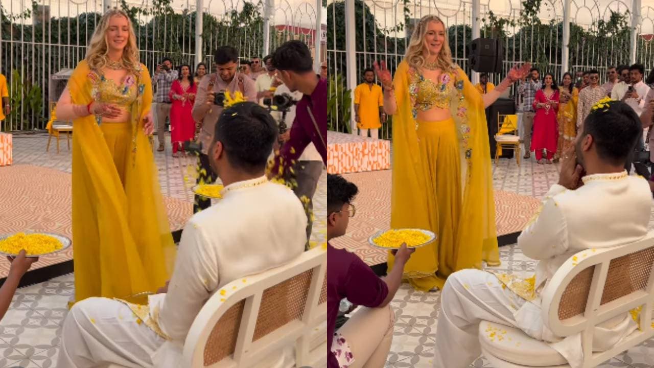 सोशल मीडिया पर एक वीडियो वायरल हो रहा है जिसमें एक डच दुल्हन अपने मारवाड़ी दूल्हे को राजस्थानी डांस करके सरप्राइज दे रही है. फूलों के साथ एंट्री लेने वाली दुल्हन ने अचानक ऐसा डांस किया कि दूल्हा और मेहमान बस देखते रह गए.