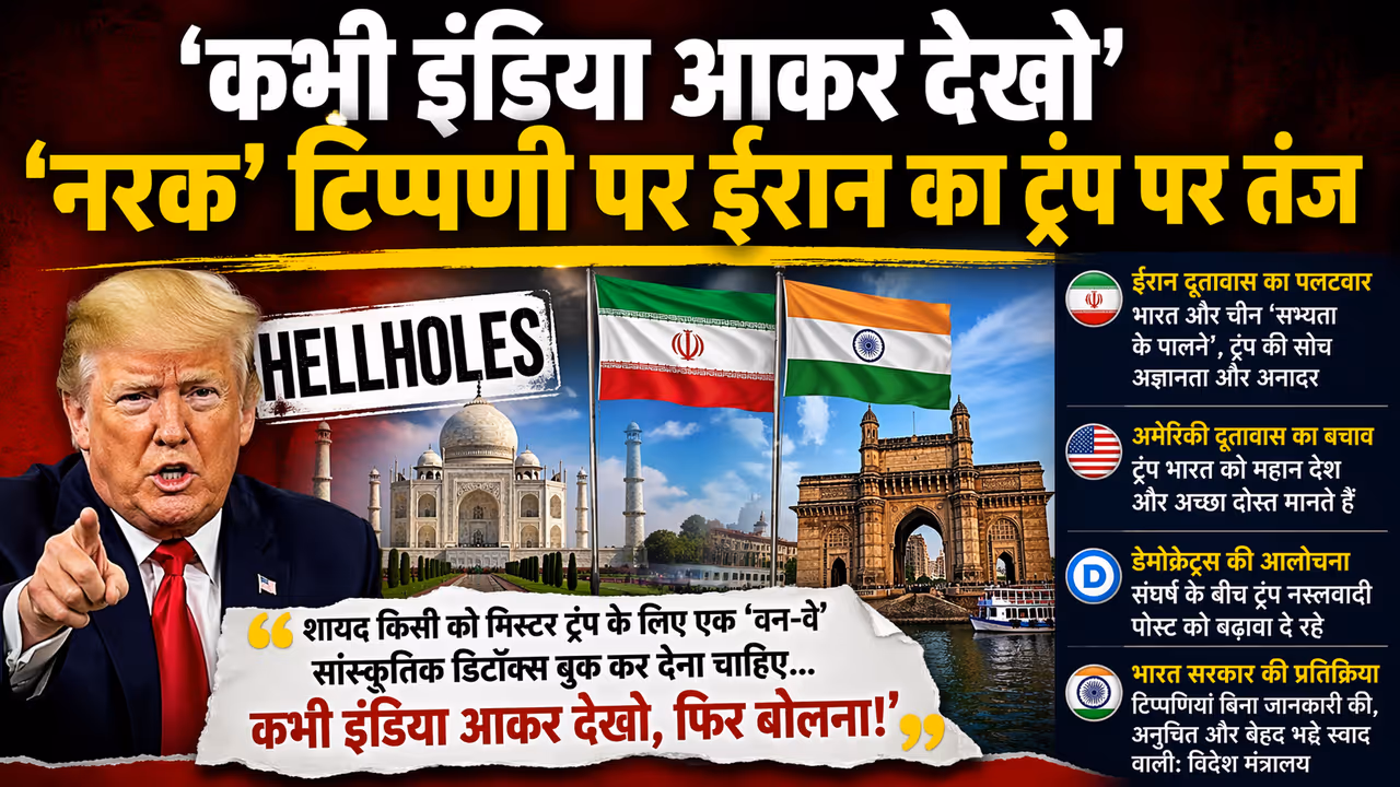 Trump Controversy: ईरान दूतावास ने मुंबई से अमेरिकी राष्ट्रपति ट्रंप की भारत-चीन को “नरक” टिप्पणी की कड़ी आलोचना की। ईरान ने जवाब में भारत को “सभ्यता का पालना” बताया और ट्रंप पर अज्ञानता का आरोप लगाया। विदेश मंत्रालय ने भी टिप्पणी को अनुचित बताया। मामला भारत-अमेरिका संबंध, ट्रंप विवाद और जन्मसिद्ध नागरिकता बहस से जुड़ा है।