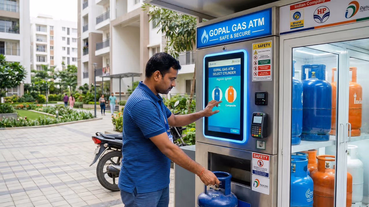 LPG ATM India Gurugram: गुरुग्राम में शुरू हुआ भारत का पहला LPG ATM, जहां अब 2-3 मिनट में गैस सिलेंडर मिल रहा है। जानिए BPCL की इस नई तकनीक का पूरा सिस्टम, कैसे काम करता है और इससे लोगों को क्या फायदा होगा।