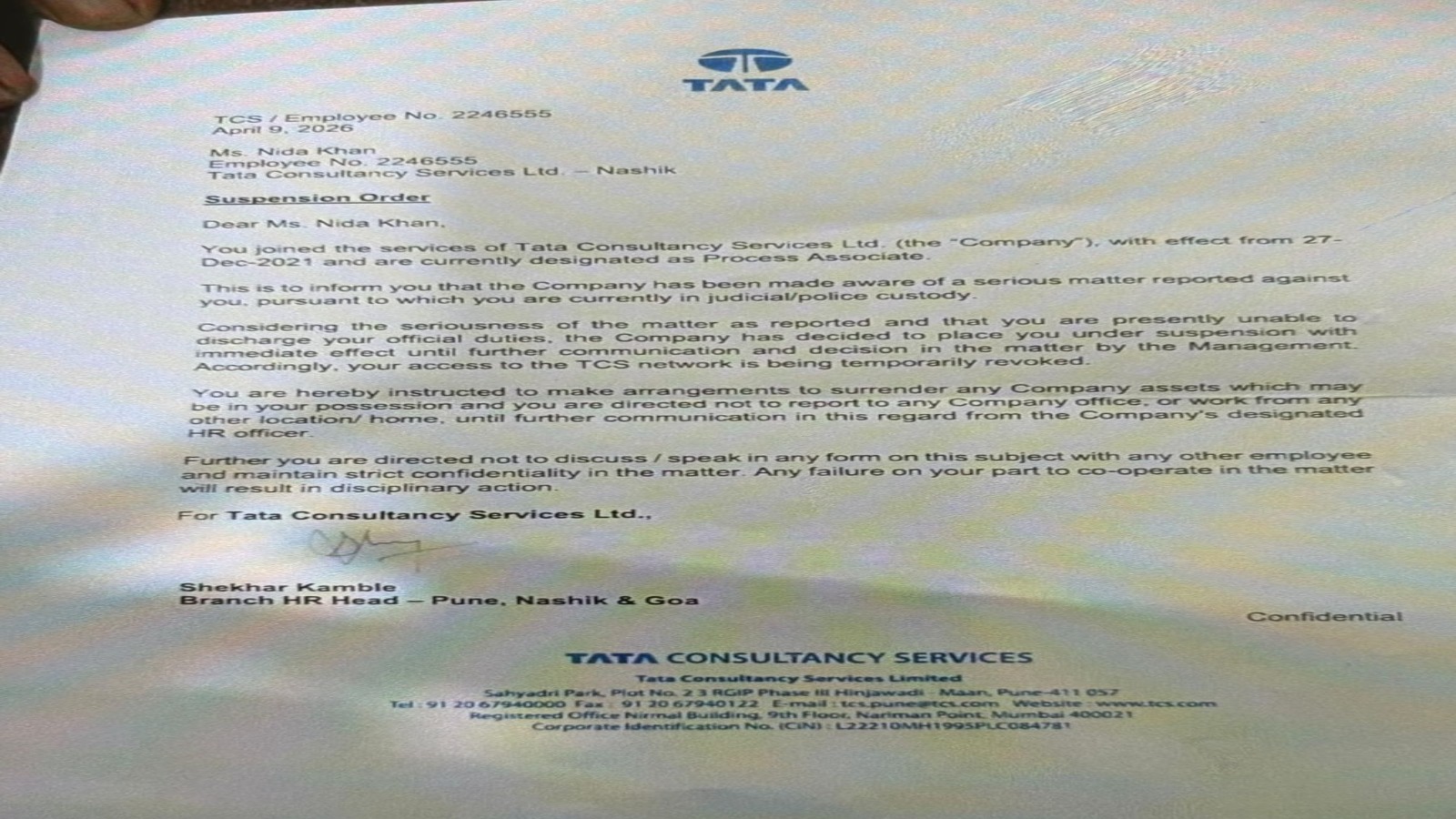 नासिक TCS केस: नासिक स्थित TCS (टाटा कंसल्टेंसी सर्विसेज) की BPO यूनिट में कथित यौन उत्पीड़न, उत्पीड़न और जबरन धार्मिक दबाव से जुड़े बहुचर्चित मामले में एक नया और अहम दस्तावेज सामने आया है। आरोपी बताई जा रही 26 वर्षीय निदा खान का सस्पेंशन लेटर सार्वजनिक हुआ है, जिसमें कंपनी ने उनके खिलाफ गंभीर आरोपों और कार्यस्थल पर अनुपस्थिति को आधार बनाकर तत्काल प्रभाव से निलंबन की कार्रवाई की है।