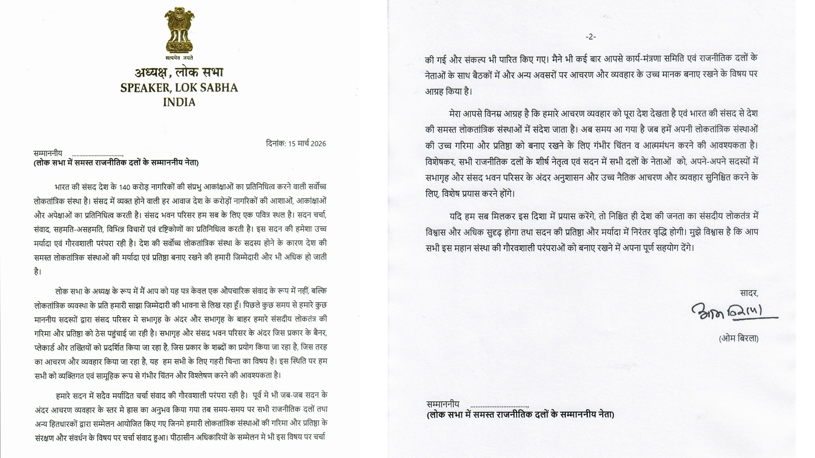 चिट्ठी के आखिर में उन्होंने कहा, "खासकर, सभी राजनीतिक दलों के शीर्ष नेतृत्व और सदन में सभी दलों के नेताओं को विशेष प्रयास करने होंगे ताकि उनके सदस्य सदन के अंदर और संसद भवन परिसर में अनुशासन और उच्च नैतिक आचरण बनाए रखें। अगर हम सब मिलकर इस दिशा में काम करें, तो संसदीय लोकतंत्र में जनता का विश्वास निश्चित रूप से और मजबूत होगा और सदन की गरिमा और सम्मान बढ़ता रहेगा। मुझे विश्वास है कि आप सभी इस महान संस्था की गौरवशाली परंपरा को बनाए रखने में पूरा सहयोग करेंगे।" बता दें कि बजट सत्र का दूसरा चरण सोमवार को शुरू होने के बाद से ही संसद के दोनों सदन बार-बार स्थगित हुए हैं। इसी संदर्भ में स्पीकर की यह चिट्ठी आई है।