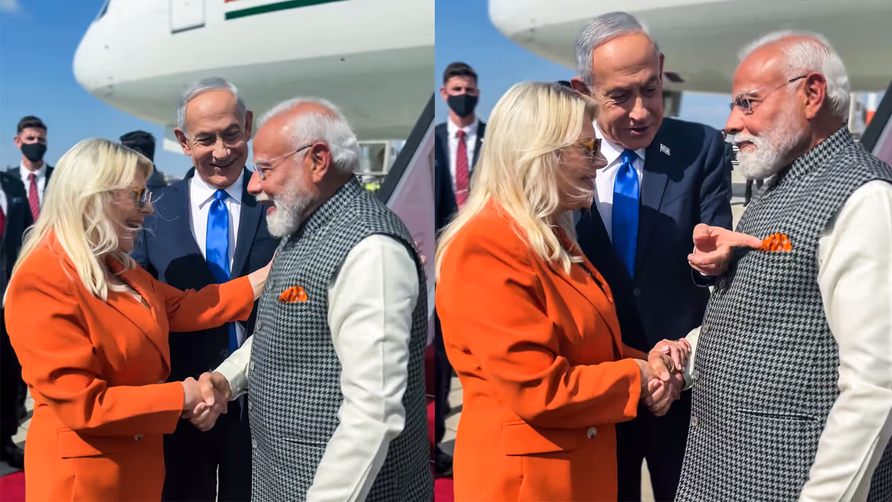 प्रधानमंत्री नरेंद्र मोदी के इजरायल पहुंचने पर बेन गुरियन एयरपोर्ट पर भव्य स्वागत हुआ। पीएम बेंजामिन नेतन्याहू और सारा नेतन्याहू ने प्रोटोकॉल तोड़कर स्वागत किया। Saffron रंग पर हल्का-फुल्का पल सोशल मीडिया पर वायरल हो रहा है।