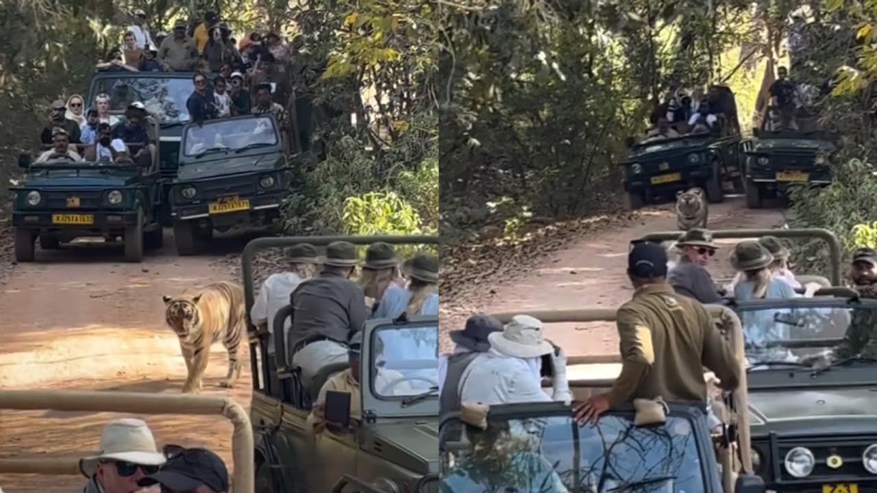 जैसे-जैसे गाड़ियों की संख्या बढ़ती है, भारतीय और विदेशी टूरिस्ट तस्वीरें और वीडियो लेना जारी रखते हैं। वहीं, चारों तरफ से घिरा टाइगर रुककर इधर-उधर देखता है, और साफ तौर पर उलझन में दिखता है कि आखिर जाए तो जाए कहां।