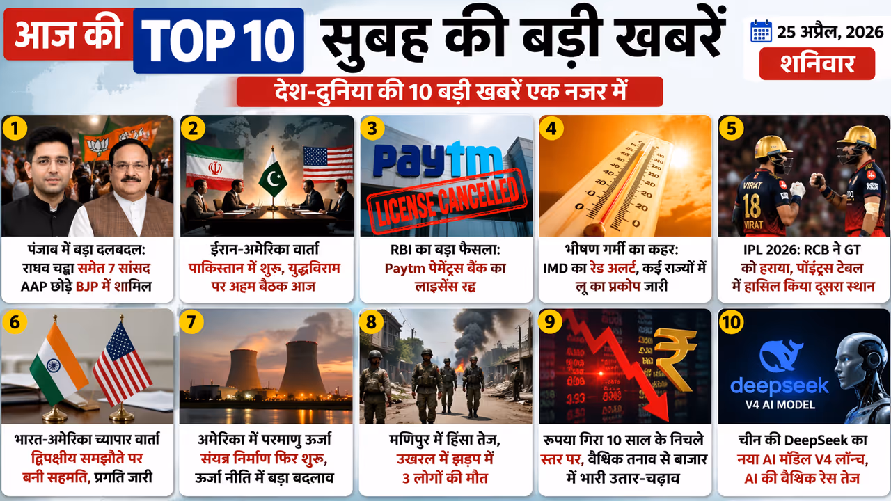 25 अप्रैल 2026 टॉप 10 न्यूज: पंजाब में AAP से BJP में बड़ा दलबदल, ईरान-अमेरिका वार्ता पाकिस्तान में, RBI ने Paytm बैंक लाइसेंस रद्द किया, देशभर में हीटवेव रेड अलर्ट, IPL 2026 में RCB की जीत, भारत-अमेरिका व्यापार समझौता प्रगति, मणिपुर हिंसा, रुपया गिरावट, DeepSeek AI लॉन्च।