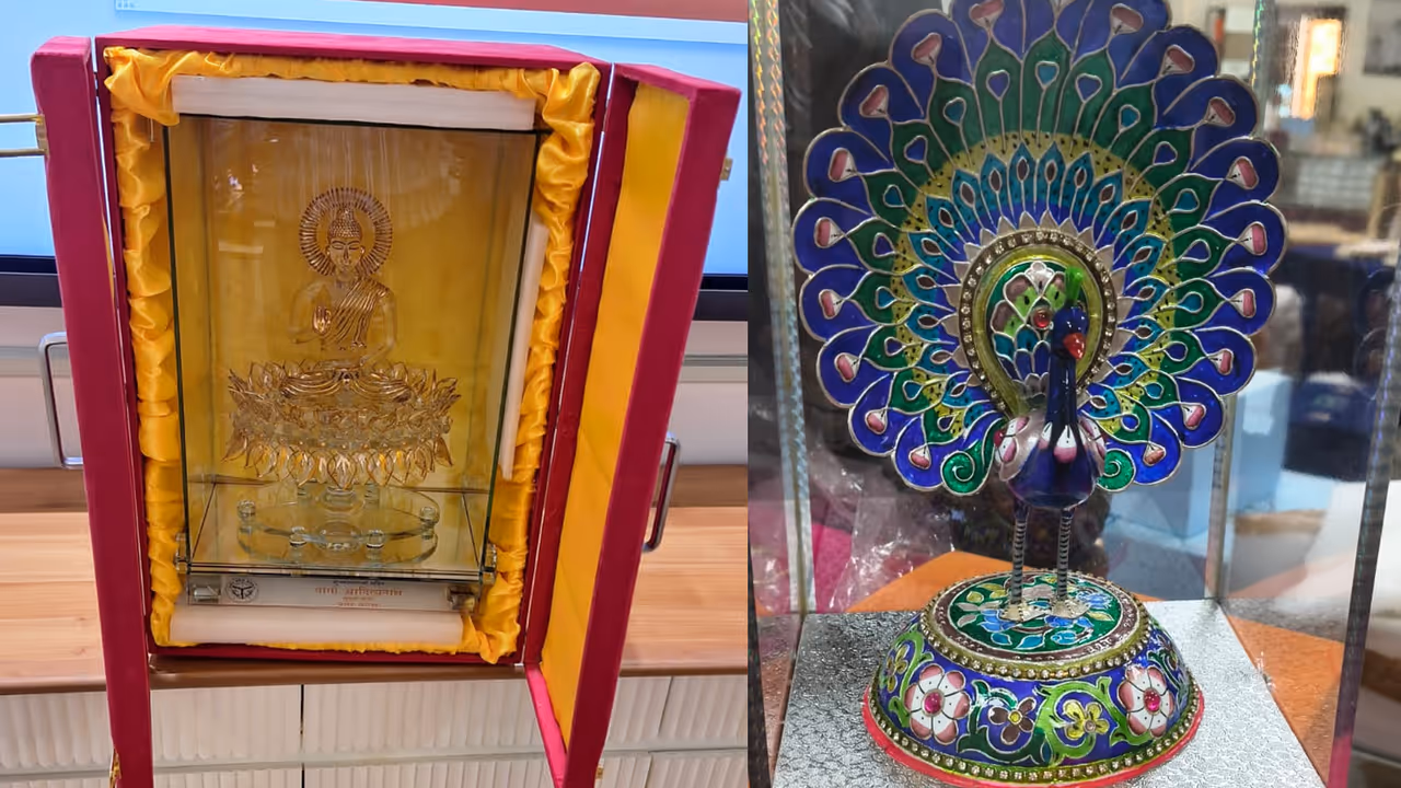 इस दौरान बनारस की गुलाबी मीनाकारी ने सभी का विशेष ध्यान आकर्षित किया। फिरोजाबाद के रंगीन कांच से बनी भगवान श्रीराम, शिव, राधा-कृष्ण और बुद्ध की प्रतिमाएं लोगों को मंत्रमुग्ध करती रहीं। मुख्यमंत्री द्वारा दिए गए उपहारों में शामिल रहे-