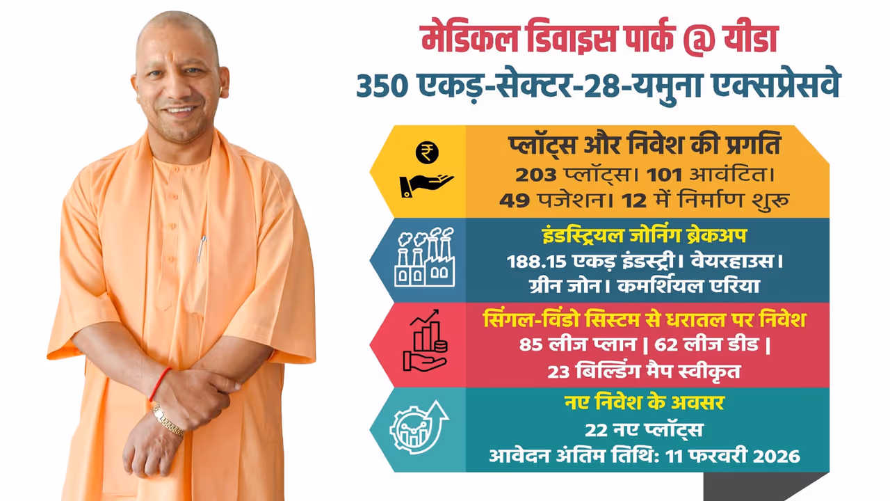 योगी आदित्यनाथ के नेतृत्व में उत्तर प्रदेश मेडिकल डिवाइस मैन्युफैक्चरिंग हब बन रहा है। YEIDA के सेक्टर-28 में 350 एकड़ में विकसित पार्क में 100 से अधिक प्लॉट आवंटित हो चुके हैं और कई यूनिट्स में निर्माण शुरू हो गया है।