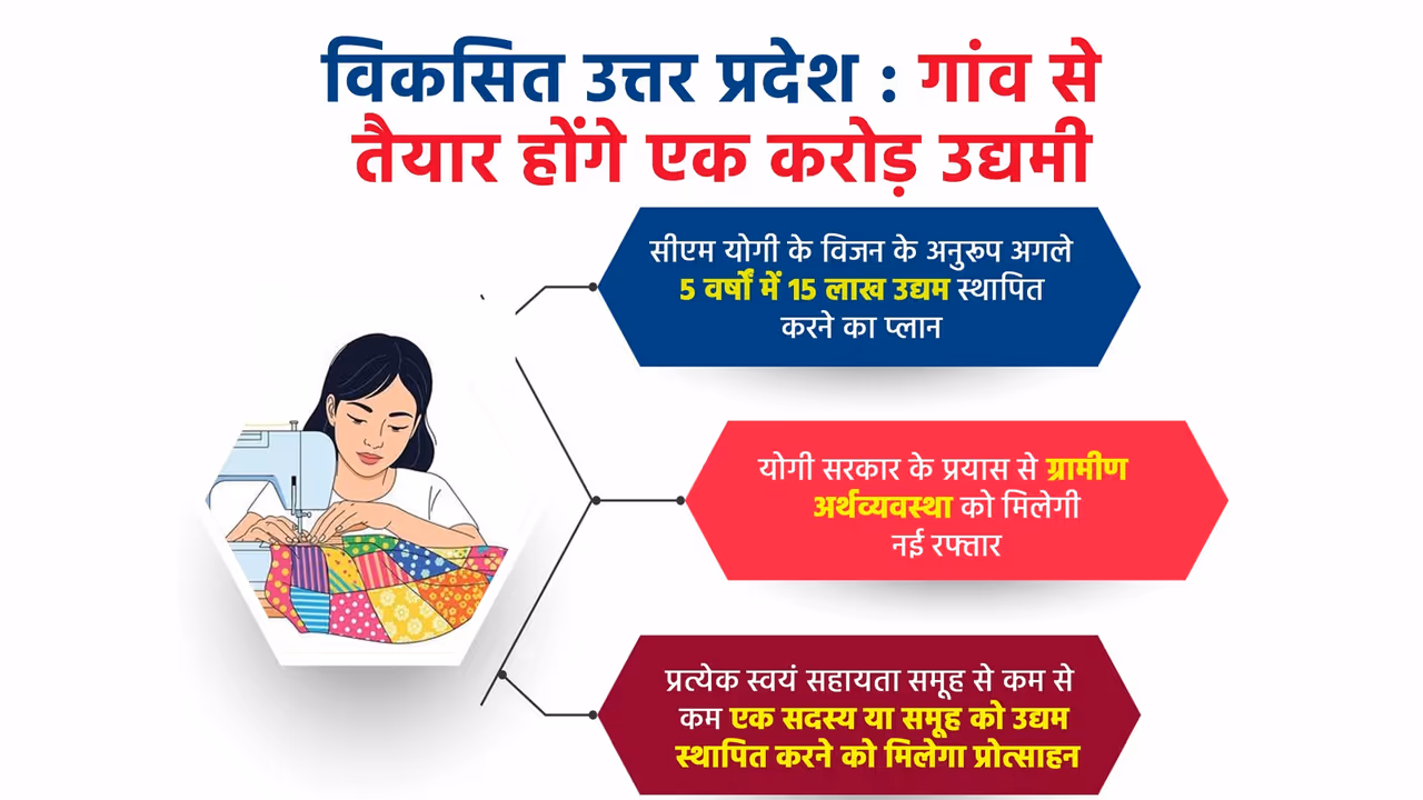 मुख्यमंत्री योगी आदित्यनाथ के विजन के तहत यूपी में अगले पांच वर्षों में 15 लाख नए उद्यम स्थापित किए जाएंगे। NRLM के जरिए स्वयं सहायता समूहों को उद्यमिता से जोड़ा जाएगा। गांवों में रोजगार बढ़ेगा और महिलाएं आत्मनिर्भर बनेंगी।