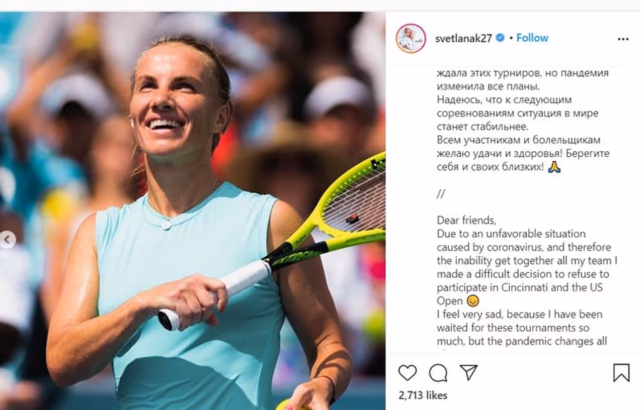 2009 में फ्रेंच ओपन जीत चुकीं कुज्नेत्सोवा ने इंस्टाग्राम पर लिखा, कि कोरोनावायरस के कारण हालात काफी खराब होते जा रहे हैं। इस टूर्नामेंट (यूएस ओपन) से हटने का फैसला लेना मेरे लिए काफी कठिन है। मैं इस टूर्नामेंट का बेसब्री से इंतजार कर रही थी। लेकिन, मैं माफी चाहती हूं कि महामारी से सारा प्लान चौपट कर दिया। उम्मीद करती हूं कि अगले ग्रैंड स्लैम तक स्थिति सामान्य हो जाएगी।