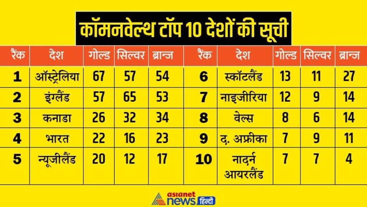 कॉमनवेल्थ गेम्स 2022 में भारत मेडल टैली में चौथे स्थान पर रहा। कुल 61 मेडल जीतकर भारत ने चौथा स्थान हासिल किया है। इस बार भी ऑस्ट्रेलियाई एथलीट्स ने शानदार प्रदर्शन जारी रखा और कुल 178 मेडल हासिल करके पहला स्थान कब्जा किया। ऑस्ट्रेलिया ने 67 गोल्ड, 57 सिल्वर मेडल और 54 ब्रान्ज मेडल जीते हैं। एथलेटिक्स में भारत ने 2010 के बाद सबसे बढ़िया प्रदर्शन किया है। भारत ने इस बार एथलेटिक्स में 1 गोल्ड मेडल, 4 सिल्वर और 3 ब्रान्ज मेडल जीते हैं। वहीं 2018 में भारत ने एथलेटिक्स में 3-3 मेडल ही जीते थे।