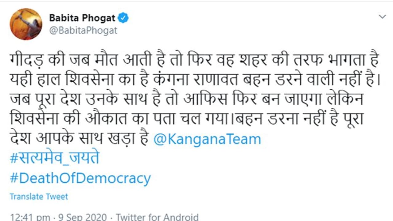 कॉमनवेल्थ गेम्स जीतने वाली बबीता फोगाट ने शिवसेना की तुलना गीदड़ से की हैं। कंगना रनौत के पक्ष में उन्होंने कई ट्वीट किए। एक ट्वीट में बबीता ने कहा कि 'गीदड़ की जब मौत आती है तो फिर वह शहर की तरफ भागता है। यही हाल शिवसेना का है'। उन्होंने आगे लिखा कि 'पूरा देश कंगना के साथ है तो आफिस फिर बन जाएगा लेकिन शिवसेना की औकात का पता चल गया। बहन डरना नहीं है पूरा देश आपके साथ खड़ा है'। इसके बाद उन्होंने कंगना के समर्थन में कई ट्वीट किए।