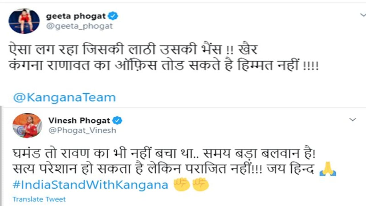 वहीं बबीता की बहन और गोल्ड मेडलिस्ट गीता फोगाट भी खुले तौर पर कंगना रनौत का समर्थन कर रही हैं। उन्होंने ट्वीट कर कहा कि 'ऐसा लग रहा जिसकी लाठी उसकी भैंस !! खैर, वे कंगना रनौत का ऑफिस तोड़ सकते है हिम्मत नहीं'। कॉमनवेल्थ गेम्स में रजत पदक जीतने वाली पूजा ढांडा ने भी कंगना का सपोर्ट किया और उनका साथ देने की बात कही। वहीं पहलवान विनेश फोगाट ने लिखा कि 'घमंड तो रावण का भी नहीं बचा था। समय बड़ा बलवान है! सत्य परेशान हो सकता है लेकिन पराजित नहीं'। बता दें कि इस समय सोशल मीडिया पर #WeSupportKanganaRanaut #SatyamevJayate #IndiaStandWithKangana काफी ट्रेंड कर रहा है।