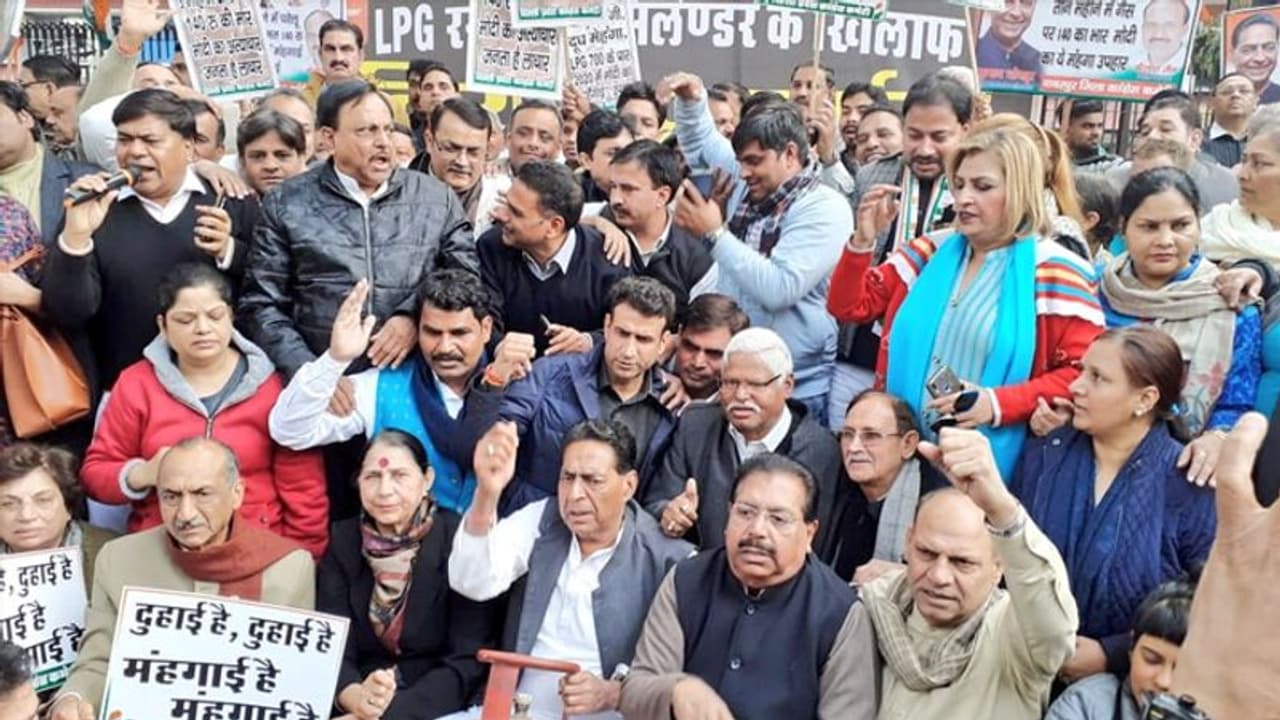 कांग्रेस की दिल्ली इकाई के वरिष्ठ नेताओं ने गैर-सब्सिडी वाले गैस सिलेंडर के दाम में बढ़ोतरी के खिलाफ बृहस्पतिवार को सिलेंडर लेकर प्रदर्शन किया