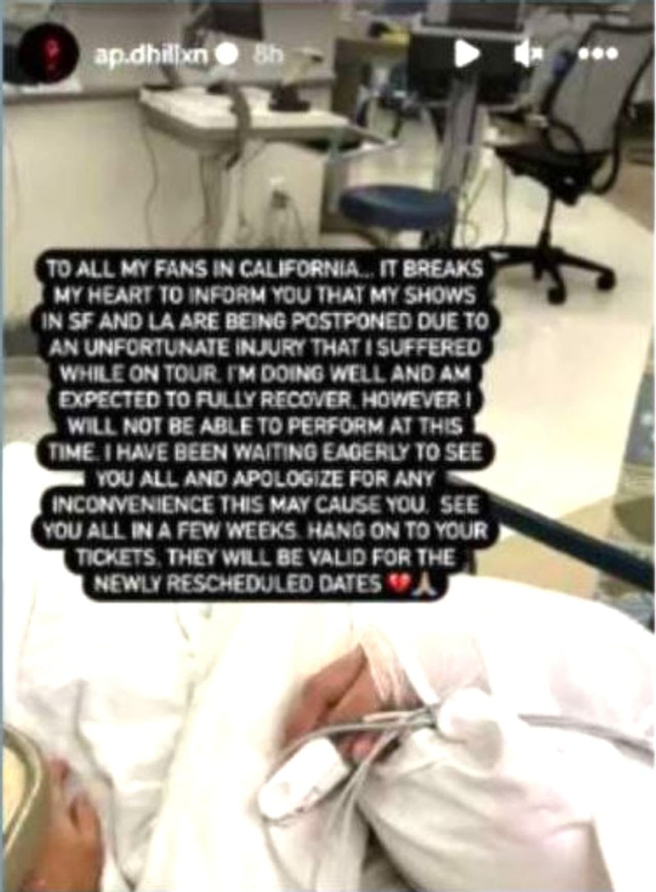 पंजाबी गानों के लिए मशहूर गायक अमरप्रीत ढिल्लो यानि एपी ढिल्लो (AP dhillon) को यूएस टूर के दौरान घायल होने के कारण हॉस्पिटल में भर्ती कराया गया है। इसकी जानकारी खुद सिंगर ने अपने सोशल मीडिया पोस्ट के जरिए दी है। इसके चलते उनके वहां होने वाले शो की डेट आगे बढ़ा दी गई है।