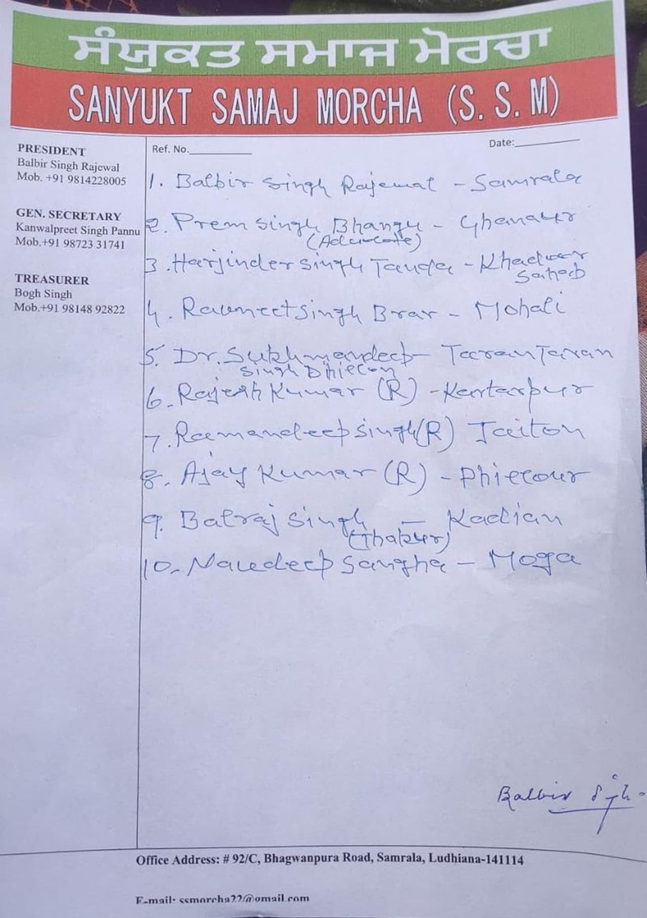 चंडीगढ़। केंद्र के तीन कृषि कानून के खिलाफ कभी आंदोलन का हिस्सा रहे 22 किसान संगठन अब संयुक्त समाज मोर्चा के रूप में पंजाब विधानसभा चुनाव में उतरने के लिए पूरी तरह तैयार हो गए हैं। संयुक्त समाज मोर्चा ने बुधवार को 10 प्रत्याशियों की पहली सूची जारी की है। इसमें मोर्चा के अध्यक्ष बलबीर सिंह राजेवाल का नाम भी है। वो समराला विधानसभा सीट से चुनाव लड़ेंगे। इसके अलावा, मोहाली से रवनीत सिंह बराड़, घनौर से प्रेम सिंह भंगू, मोगा से नवदीप संघ, हरजिंदर सिंह टांडा खडूर साहिब से, डॉ. सुखमनदीप सिंह ढिल्लो तरनतारन से, राजेश कुमार करतारपुर से, रमनदीप सिंह जैतो से, अजय कुमार फिल्लौर से, बलराज सिंह ठाकुर कादियां से संयुक्त समाज मोर्चा के प्रत्याशी होंगे।