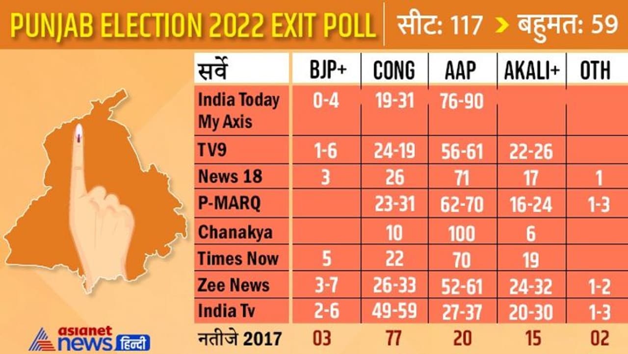 वहीं, TV9 के सर्वे में आप को 56 से 61 सीट, कांग्रेस को 24 से 19 सीट, अकाली गठबंधन को 22 से 26 सीट मिलने का अनुमान है। वहीं, भाजपा और पीएलसी को 1 से 6 सीट तथा अन्य को 0 से 3 सीट मिलने का अनुमान है। वहीं, न्यूज 18 के एग्जिट पोल में आप को 71 सीट, कांग्रेस को 26, अकाली गठबंधन को 17, भाजपा को 3 और अन्य को एक सीट मिलने का अनुमान जताया गया है। रिपब्लिक P-MARQ की रिपोर्ट में आप को 62 से 70, कांग्रेस को 23 से 31 अकाली दल काे 16 से 24 और अन्य को एक से 3 सीट मिलने का अनुमान है।