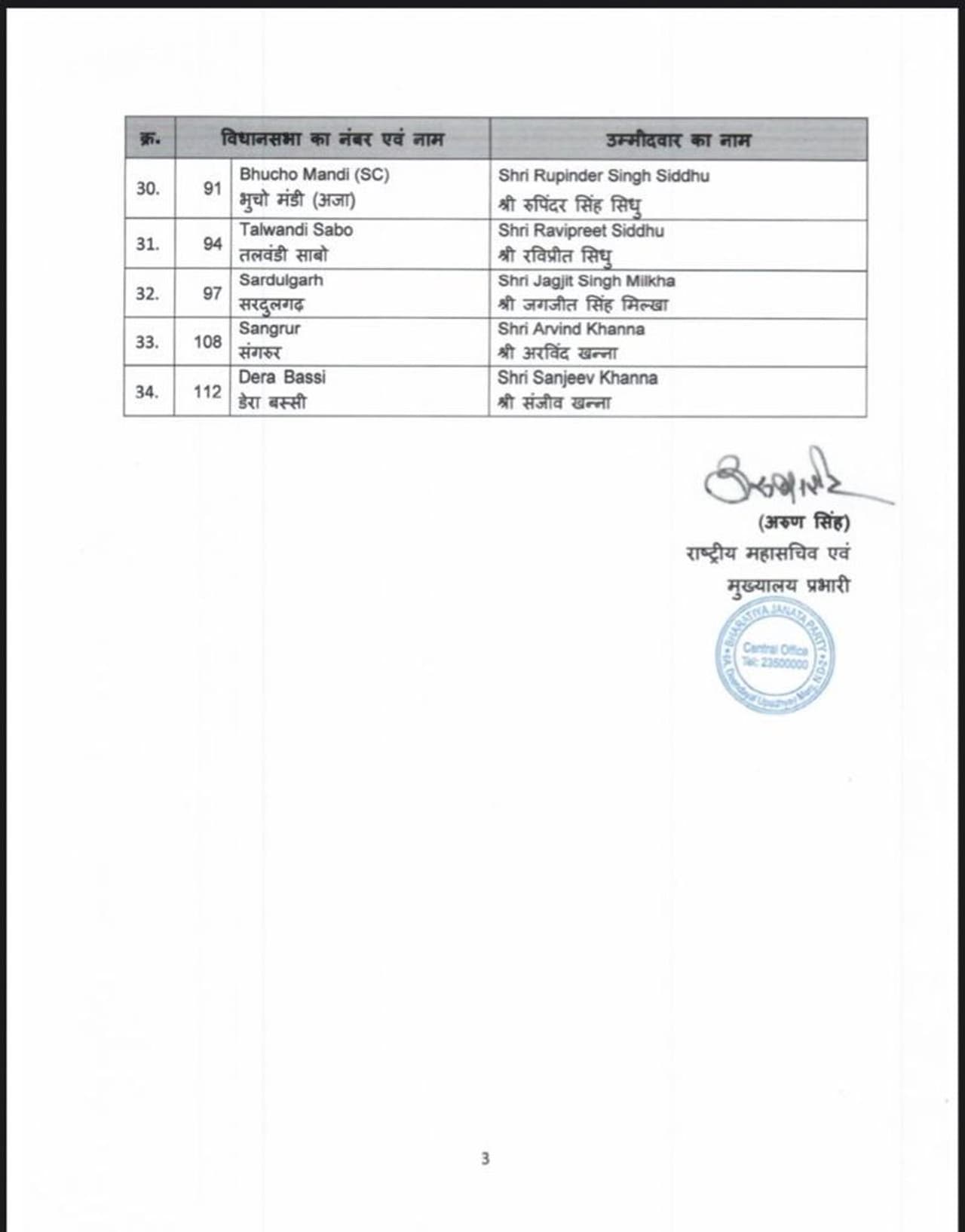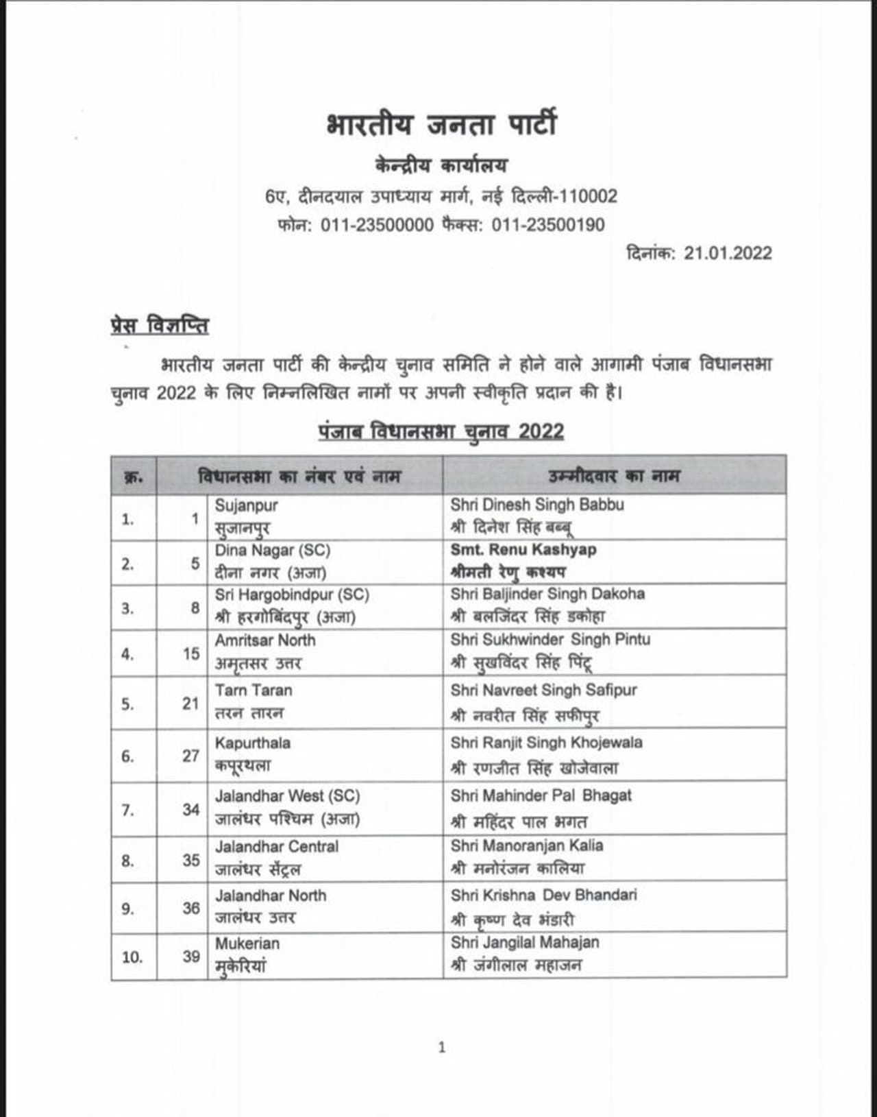 पंजाब विधानसभा चुनाव के लिए भाजपा ने भी प्रत्याशियों की पहली सूची जारी कर दी है। इसमें 34 उम्मीदवारों के नाम जारी किए हैं।