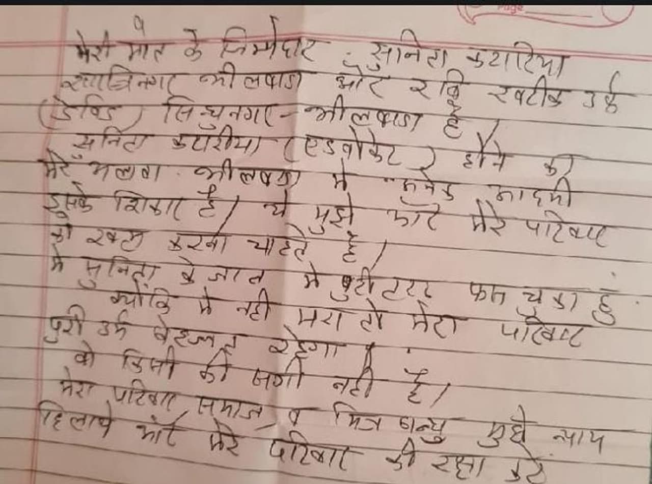 राजेंद्र ने अपने सुसाइड नोट में लिखा है कि मेरी मौत की जिम्मेदार सुनीता कटारिया शांति नगर भीलवाड़ा और रवि खटीक है। इन दोनों के भीलवाड़ा में मेरे अलावा और भी कई लोग शिकार हो चुके हैं। यह मुझे और मेरे परिवार को खत्म करना चाहते हैं। मैं सुनीता के जाल में बुरी तरह से फंस चुका हूं। अगर मैं नहीं मारा तो मेरा पूरा परिवार परेशान रहेगा। वह किसी की सगी नहीं है। मेरा परिवार समाज और मित्र बंधु मुझे न्याय दिलाएं और परिवार की रक्षा करें। मेरे दोनों बिग बॉस रामपाल और हमेंद्र जी मेरे परिवार की ओर से सहायता करें।