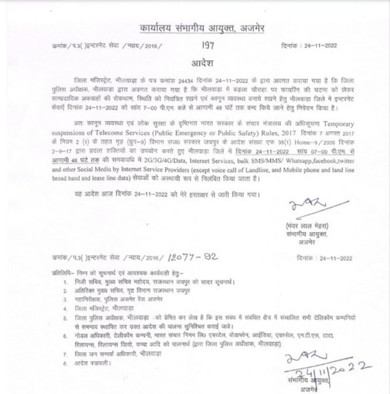 राहुल गांधी की यात्रा से पहले भीलवाड़ा में बढ़ी टेंशन। दरअसल यहां दिनदहाड़े युवक की गोली मारकर हत्या कर दी गई। वारदात के बाद तनाव का माहौल। जिले में 48 घंटे के लिए इंटरनेट बंद करने के आदेश आ गए है। अजमेर रेंज आईजी भीलवाड़ा के लिए रवाना।