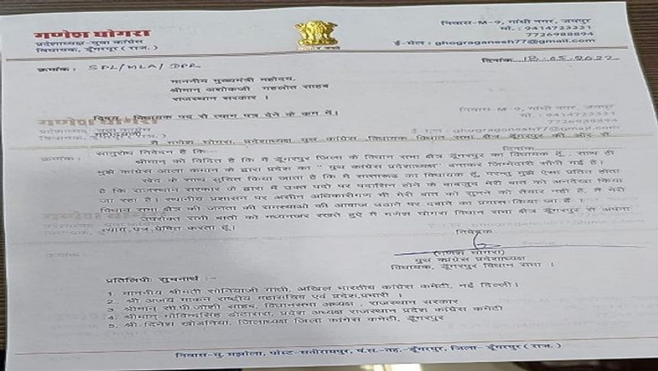 जयपुर.डूंगरपुर में एसडीएम को बंधक बनाने के आरोप में कांग्रेस विधायक गणेश घोघरा पर एफ आई आर दर्ज हो गई है । FIR दर्ज होने के मामले ने इतना तूल पकड़ा कि नाराज कांग्रेसी विधायक और यूथ कांग्रेस के अध्यक्ष गणेश घोघरा ने अपने विधायक पद से इस्तीफा देने का मन बना लिया । उन्होंने मुख्यमंत्री समेत सोनिया गांधी, अजय माकन, सीपी जोशी, गोविंद सिंह डोटासरा समेत अन्य दिग्गज नेताओं को अपने इस्तीफे की कॉपी भेज दी । घोगरा के इस्तीफा का यह नया मामला सरकार के गले पड़ता जा रहा है । इस मामले में अन्य विधायक भी घोघरा के साथ आकर खड़े हो रहे हैं ।