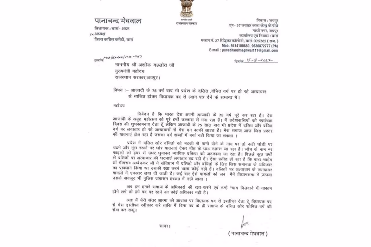 विधायक पानाचंद मेघवाल ने अपना इस्तीफा राज्य के सीएम अशोक गहलोत को भेजा है। उन्होंने इस्तीफे में कहा कि जालौर जिले में 9 साल की दलित छात्र इंद्र कुमार की मौत से मैं बेहद आहत हूं और अपना इस्तीफा दे रहा हूं। उन्होंने कहा कि आजादी के 75 साल बाद भी दलित और वंचित समुदाय लोगों पर लगातार अत्याचार हो रहे हैं और उन्हें यातनाएं दी जा रही हैं।