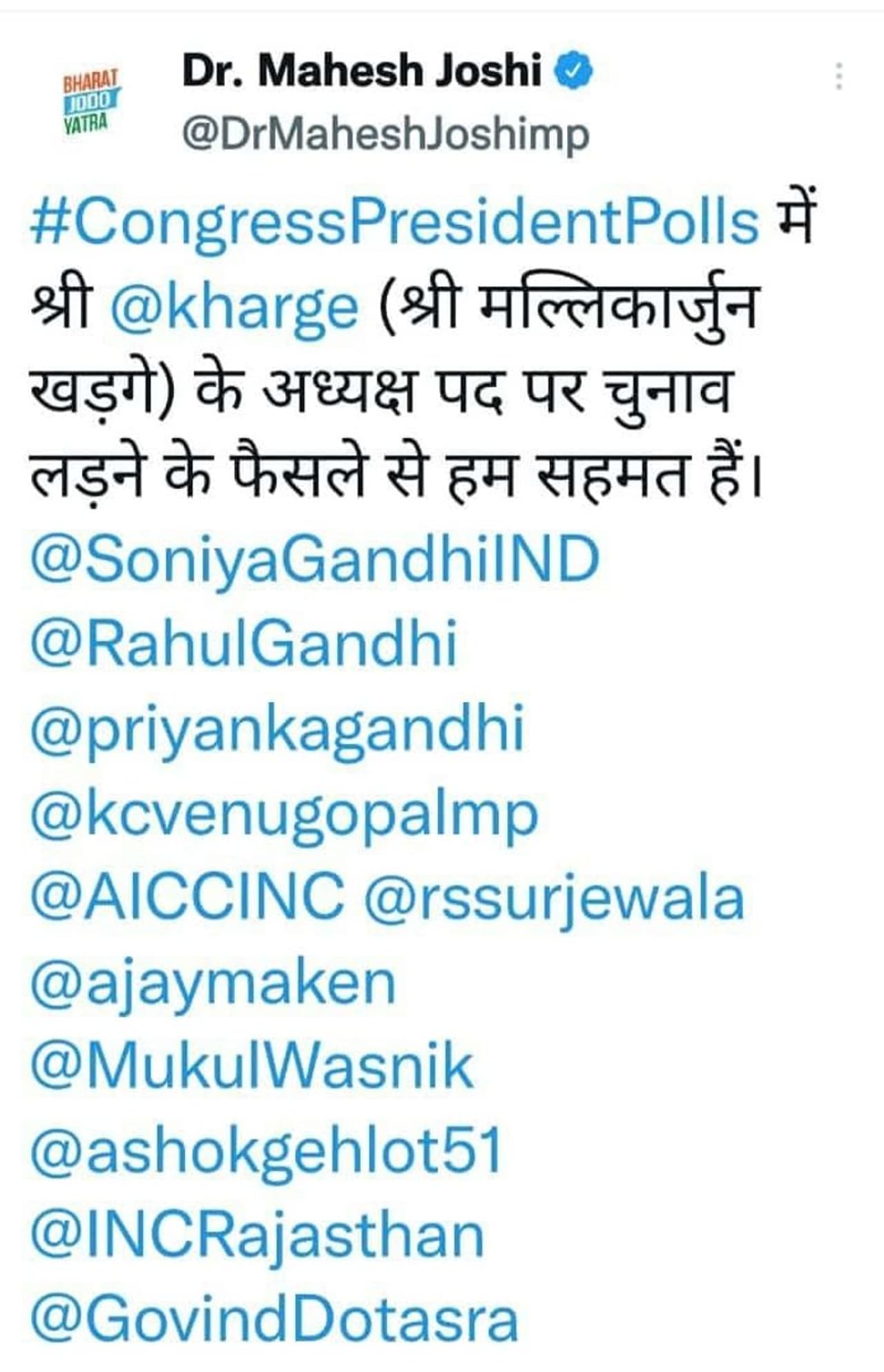 गौरतलब है कि इससे पहले गुरुवार को सीएम अशोक गहलोत ने पार्टी आलाकमान से दोपहर में बात की और अपने विधायकों द्वारा जयपुर में किए गए सियासी तमाशे को लेकर सोनिया गांधी को माफीनामा भी सौंपा। जिसके बाद देर रात सचिन पायलट भी आलाकमान से बात करने के लिए पहुंचे थे। ऐसे में आलाकमान ने ही शुक्रवार सुबह इस पर निर्णय कर लिया। और गहलोत को मलिकार्जुन खड़गे के साथ कर दिया है। जिसके बाद अब राजस्थान में भी विधायकों ने सचिन पायलट के में का विरोध करना बंद कर दिया है।