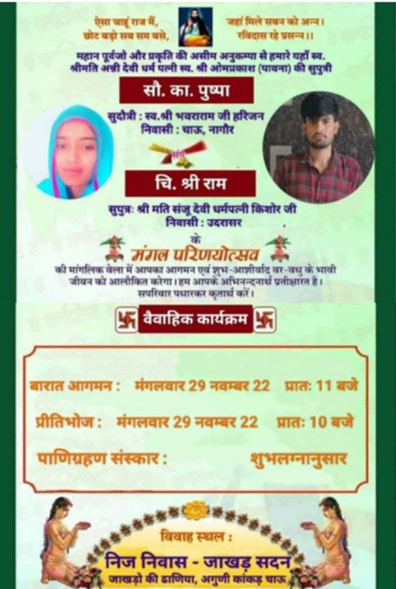 दरअसल नागौर जिले के चाऊ गांव में रहने वाली वाल्मीकि समाज की लड़की पुष्पा के माता-पिता की कुछ सालों पहले मौत हो गई। गांव के ही देवाराम जाखड़ ने उसे पढ़ाया, लिखाया और अपनी बेटी की तरह रखा। और अब उसकी शादी का खर्चा भी उठा रहे हैं। खास बात तो यह है कि इस शादी में जो भी रस्में निभाई जा रही है वह जाट और वाल्मीकि समाज दोनों की ही है। कार्ड में विवाह स्थल का नाम जाखड़ भवन लिखवाया है। देवाराम ने बताया कि यदि वह चाहते तो इस शादी को कहीं और करने के लिए पैसे भी खर्च कर सकते थे। लेकिन उन्होंने जाति धर्म आदि के भेज को दूर करने के लिए यह शुरुआत की है। इतना ही नहीं इस शादी के कार्ड पर ज्योतिबा फुलेए डॉक्टर भीमराव अंबेडकर भगत सिंह और बिरसा मुंडा समेत कई महापुरुषों के स्लोगन भी लिखे गए हैं। जो समाज में जातिवादए छुआछूत न करने के हैं।