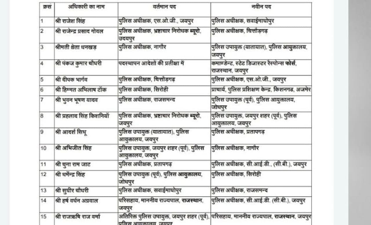 राज्य सरकार ने जिन अफसरों का तबादला किया है उनमें 8 जिलों के एसपी शामिल हैं। जिसमें शराब तस्करी के मामले में विवादों में आए सिरोही  के एसपी अभिलाष टांक और नागौर के एसपी श्वेता धनकड़ के नाम भी हैं।