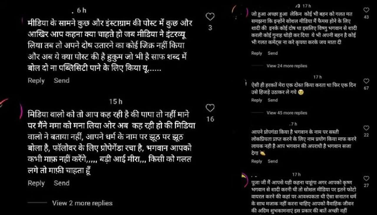 अब पूजा ने सोशल मीडिया पर लिखा कि उसे बेवजह मीरा बना दिया, उसने सिर्फ मंगल दोष हटाने के लिए शादी की थी। तब यूजर्स का गुस्सा भड़क गया....। एक यूजर ने लिखा कि मंगल दोष तो 26 साल में अपने आप खत्म हो जाता है, आप तो 30 की हो...। एक ने लिखा आपके फॉलोअर 13 हजार से बढ़कर 19 हजार हो गए बधाई हो...।