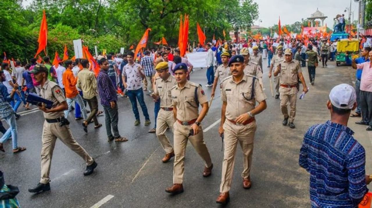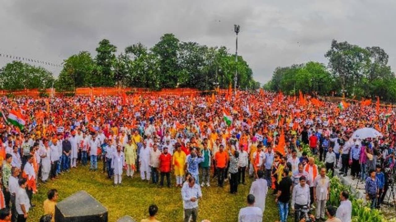 हाथों में तिरंगा और भगवा झंडे लेकर सरकार के खिलाफ की नारेबाजी
