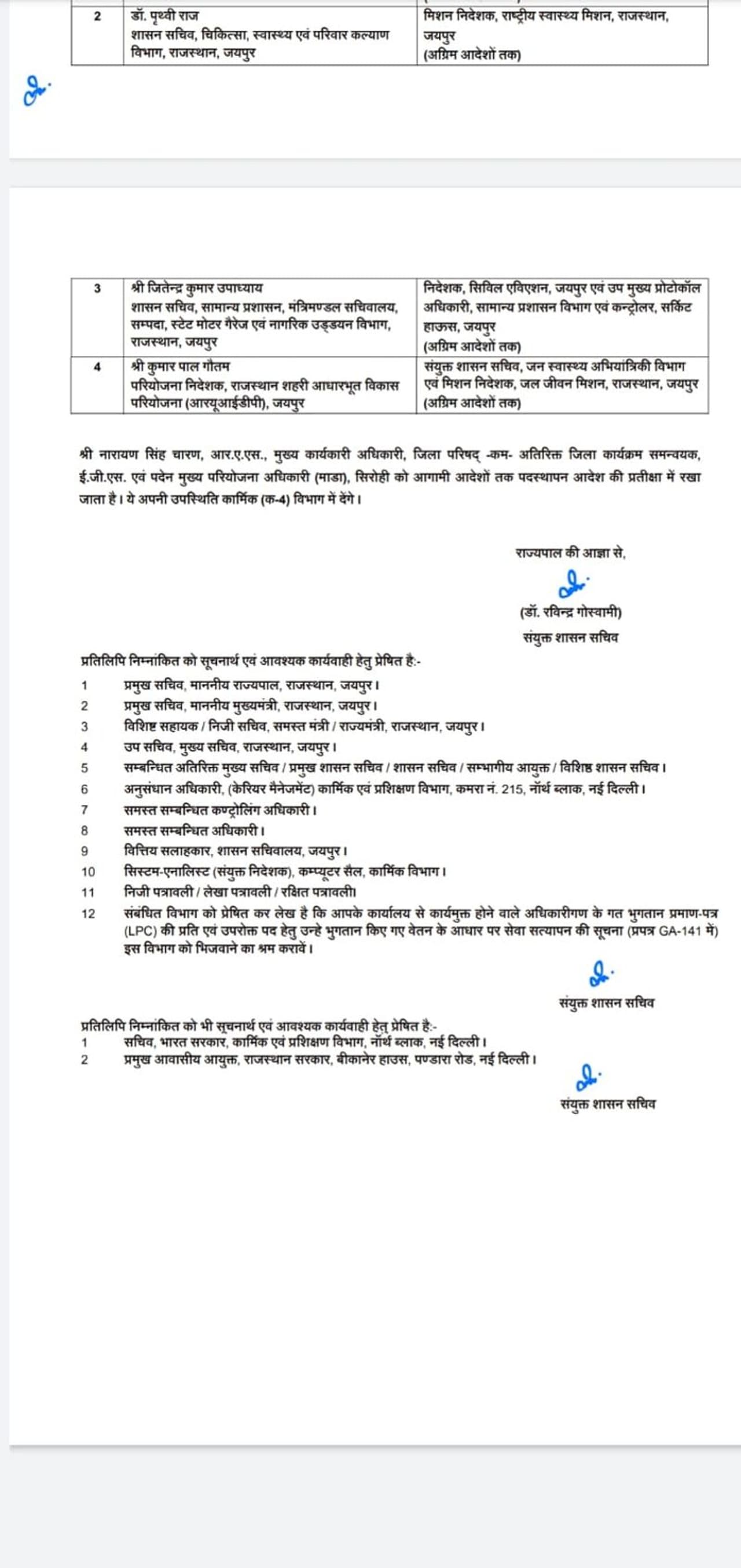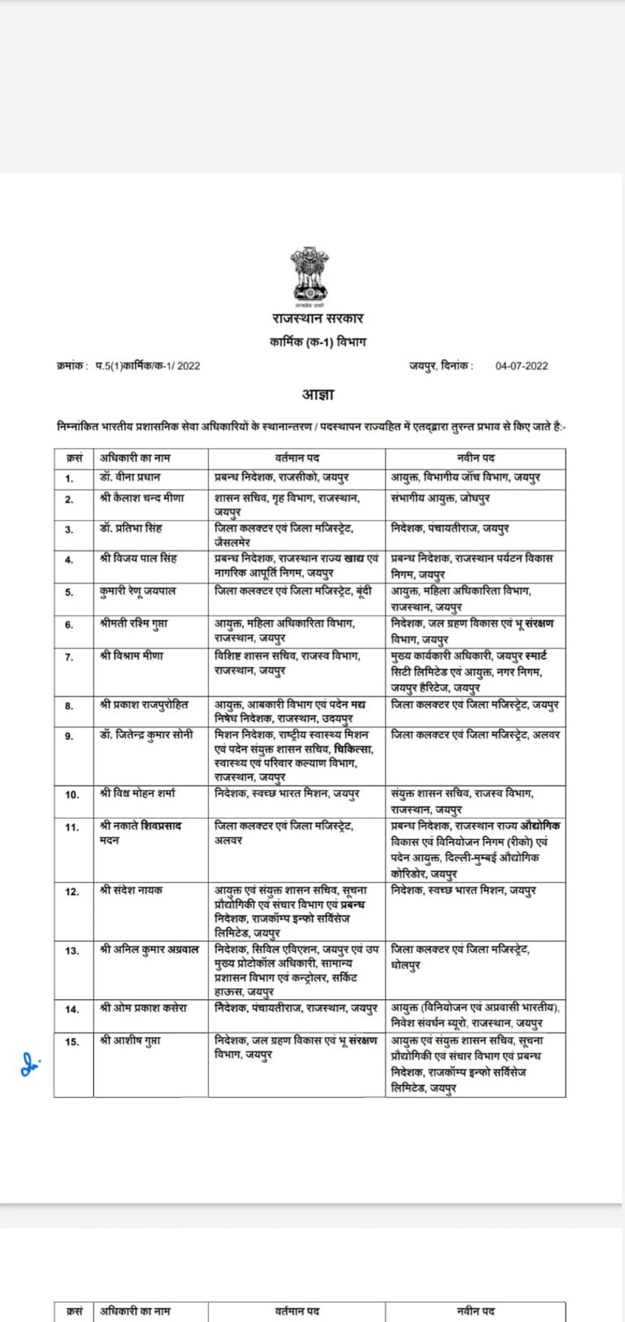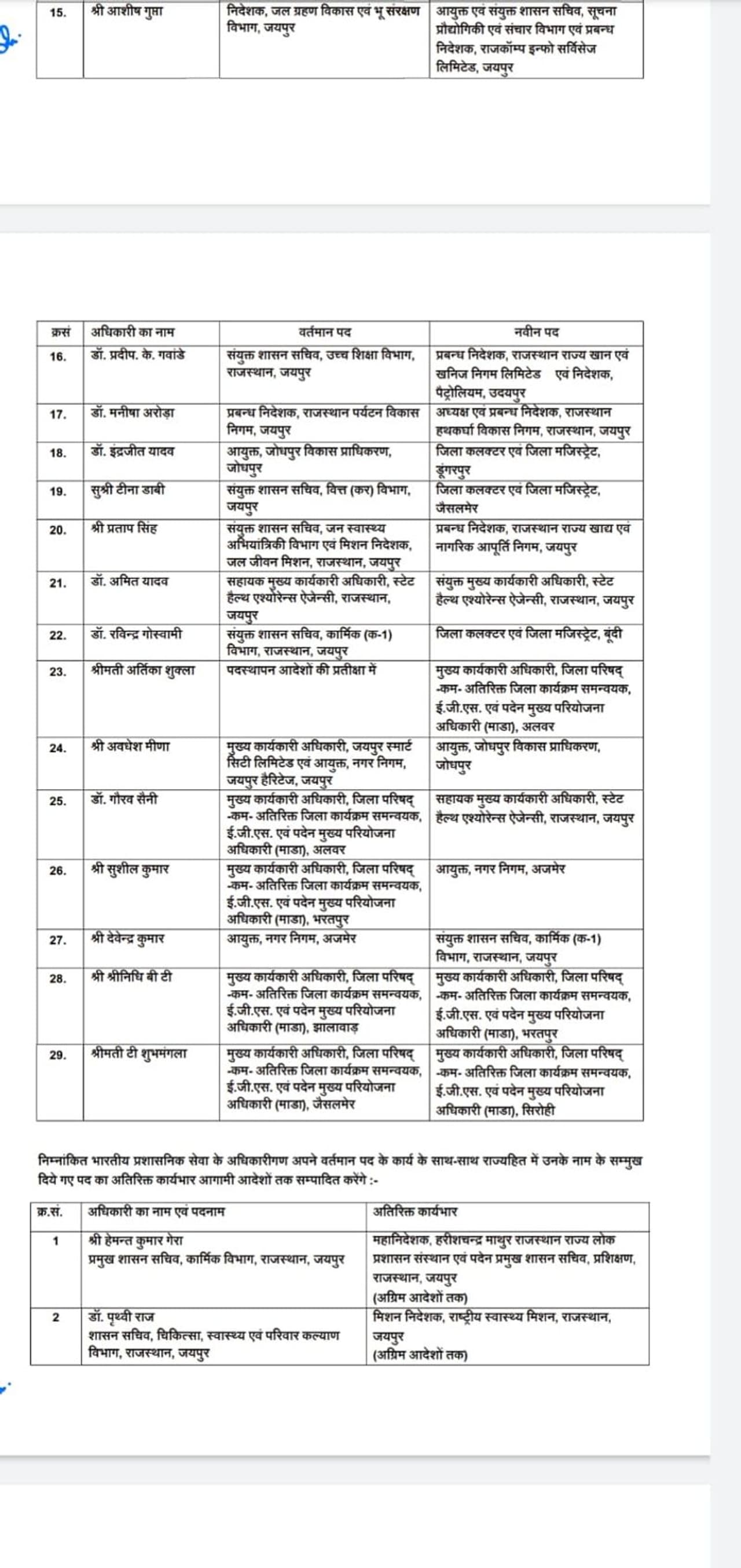 कार्मिक विभाग की ओर से जारी सूची में डॉ वीणा प्रधान को विभागीय जांच आयुक्त, कैलाश चंद मीणा को संभागीय आयुक्त जोधपुर, डॉ प्रतिभा सिंह को निदेशक पंचायती राज, विजय पाल सिंह को प्रबंध निदेशक राजस्थान पर्यटन विकास निगम, कुमारी रेणु जयपाल को आयुक्त महिला अधिकारिता विभाग जयपुर, रश्मि गुप्ता को निदेशक जल ग्रहण विकास एवं भू संरक्षण विभाग जयपुर, जितेंद्र कुमार सोनी को जिला कलेक्टर अलवर, विश्व मोहन शर्मा को संयुक्त शासन सचिव राजस्व विभाग जयपुर, नकाते शिवप्रसाद मदन को प्रबंधन निदेशक रीको, संदेश नायक को निदेशक स्वच्छ भारत मिशन जयपुर, अनिल कुमार अग्रवाल को जिला कलेक्टर, धौलपुर ओम प्रकाश कसेरा को आयुक्त निवेश संवर्धन ब्यूरो जयपुर, आशीष गुप्ता को आयुक्त doit, मनीषा अरोड़ा को अध्यक्ष एवं प्रबंध निदेशक राजस्थान हथकरघा विकास निगम, डॉ इंद्रजीत यादव को जिला कलेक्टर डूंगरपुर, प्रताप सिंह को प्रबंध निदेशक राजस्थान राज्य खाद्य एवं नागरिक आपूर्ति निगम, डॉ अमित यादव को संयुक्त मुख्य कार्यकारी अधिकारी स्टेट हेल्थ इंश्योरेंस एजेंसी डॉ रविंद्र गोस्वामी को जिला कलेक्टर बूंदी, अर्तिका शुक्ला को सीईओ जिला परिषद अलवर, गौरव सैनी को सहायक मुख्य कार्यकारी अधिकारी स्टेट हेल्थ इंश्योरेंस एजेंसी, सुशील कुमार को आयुक्त नगर निगम अजमेर, देवेंद्र कुमार को संयुक्त शासन सचिव कार्मिक क- वन विभाग, श्रीनिधि पीटी को मुख्य कार्यकारी अधिकारी जिला परिषद भरतपुर और टी शुभमंगला को सीईओ जिला परिषद सिरोही बनाया गया है।