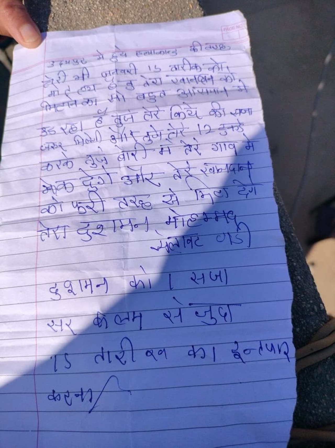 दरअसल उदयपुर के सराड़ा क्षेत्र के झाडोल गांव का यह पूरा घटनाक्रम है। पुलिस ने बताया कि मंगलवार देर रात गांव के ही एक दुकानदार गौतम पटेल से कुछ लोगों ने मारपीट की। वह घर लौट रहा था। घर मे घुसने के बाद पत्थरबाजी कर दी। पुलिस को सूचना दी तो वे लोग भाग गए। बाद में जब बुधवार को गौतम गांव में दुकान पर गया तो उसने वहां पर एक लैटर पाया। लैटर में लिखा था कि पंद्रह जनवरी तक तेरे बारह टुकड़े कर देंगे। सजा एक ही है सिर तन से जुदा करने की...। अब पूरा परिवार टेंशन में है। पुलिस को इस मामले में परिवाद दिया गया है। परिवाद के साथ ही लैटर भी सौंपा गया है। पुलिस ने कहा कि अब केस दर्ज कर रहे हैं। हर संभव तरीके से जांच पड़ताल की जा रही है।