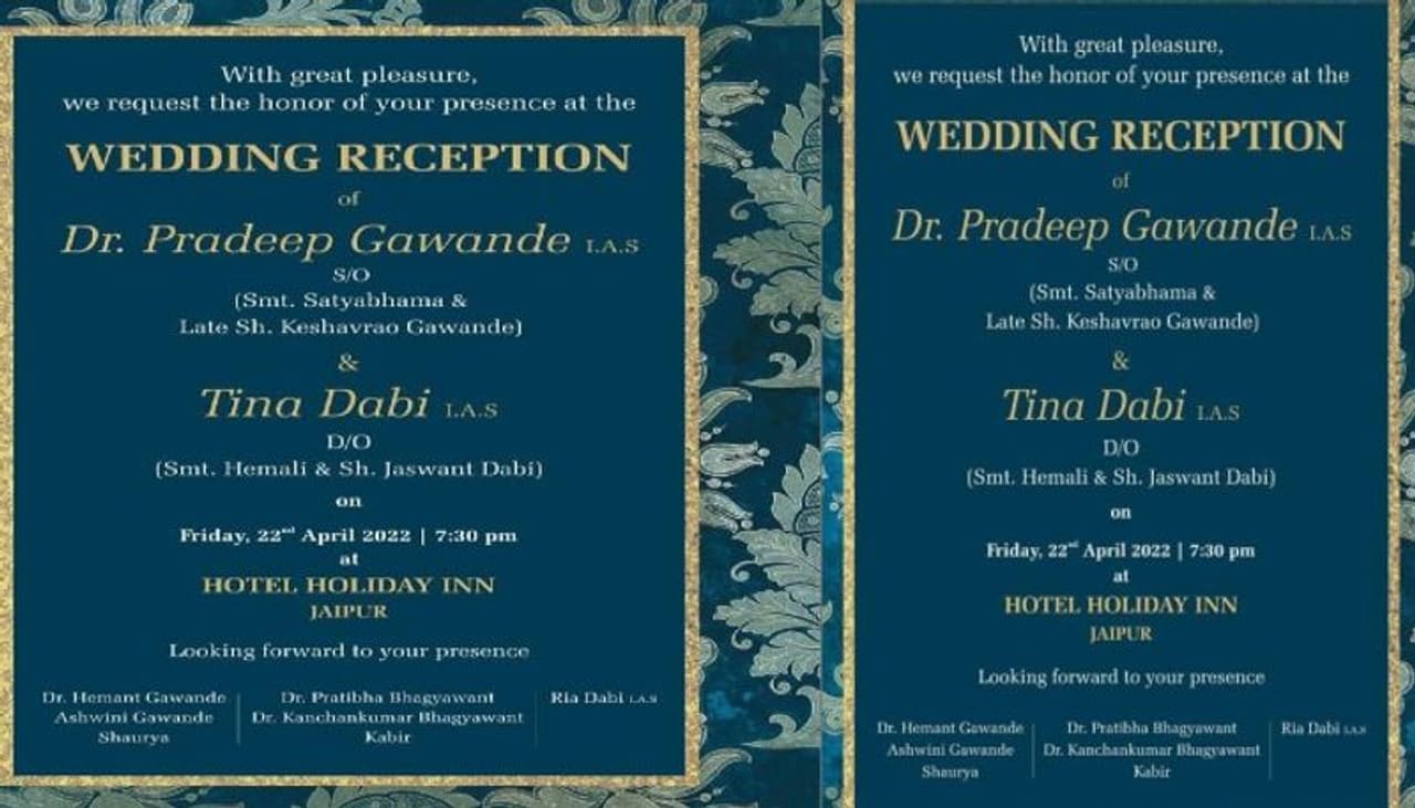 दरअसल, टीना डाबी और प्रदीप गंडावे की इस हाईप्रोफाइल शादी का जो वेडिंग कार्ड सामने आया है, उसके मुताबिक यह दोनों अफसर 20 अप्रैल 2022 को शादी के बंधन मे बंध जाएंगे। वहीं दो दिन बाद यानि 22 अप्रैल को जयपुर के होटल होलिडे में इनका वेडिंग रिसेप्शन होगा। जिसमें राज्य के कई बड़े अफसर और राजनेता शिरकत करेंगे।