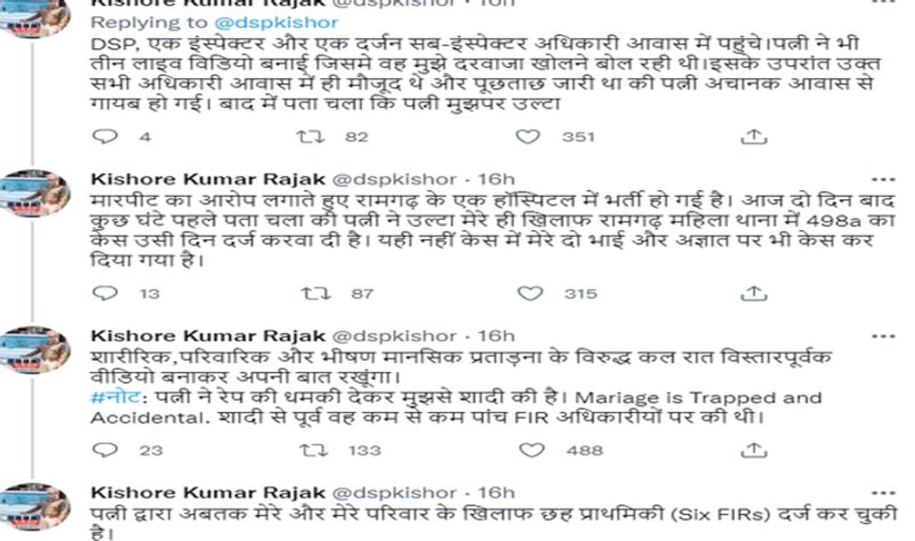 डीएसपी किशर कुमार रजक ने एक के बाद एक कई ट्वीट करके बीवी के अत्याचार की कहानी बताई है। एक ट्वीट में उन्होंने लिखा कि पत्नी ने रेप की धमकी देकर मुझसे शादी की। शादी से पहले उसने कम से कम पांच अधिकारियों पर एफआईआर दर्ज कराई थी। इसके साथ उन्होंने सबूत के तौर पर एक वीडियो भी पोस्ट किया है। जिसमें उनकी पत्नी उनपर हमला करती दिखाई दे रही हैं।