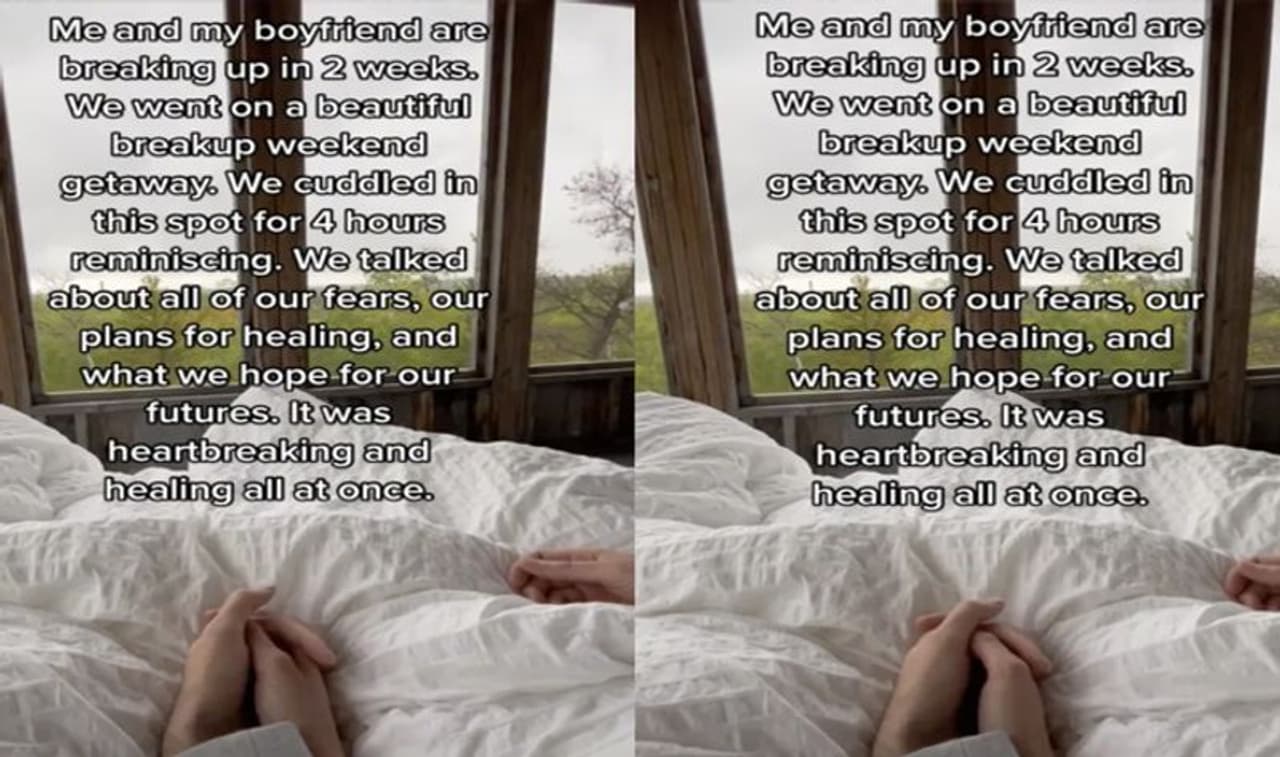 टिकटॉक पर @tovahparpar नाम के महिला यूजर ने एक वीडियो शेयर की। जिसमें वो बिस्तर पर अपने होने वाले एक्स ब्वॉयफ्रेंड के हाथों को पकड़े हुए लेटी हैं। उसने लिखा,'हम अपने रिश्ते को खत्म करने से पहले एक खूबसूरत ट्रिप पर हैं। जहां हम अपने गुजरे हुए पलों के खूबसूरत यादों को साझा कर रहे हैं और ब्रेकअप के बाद होने वाले दर्द से कैसे उबरेंगे इस पर चर्चा कर रहे हैं।