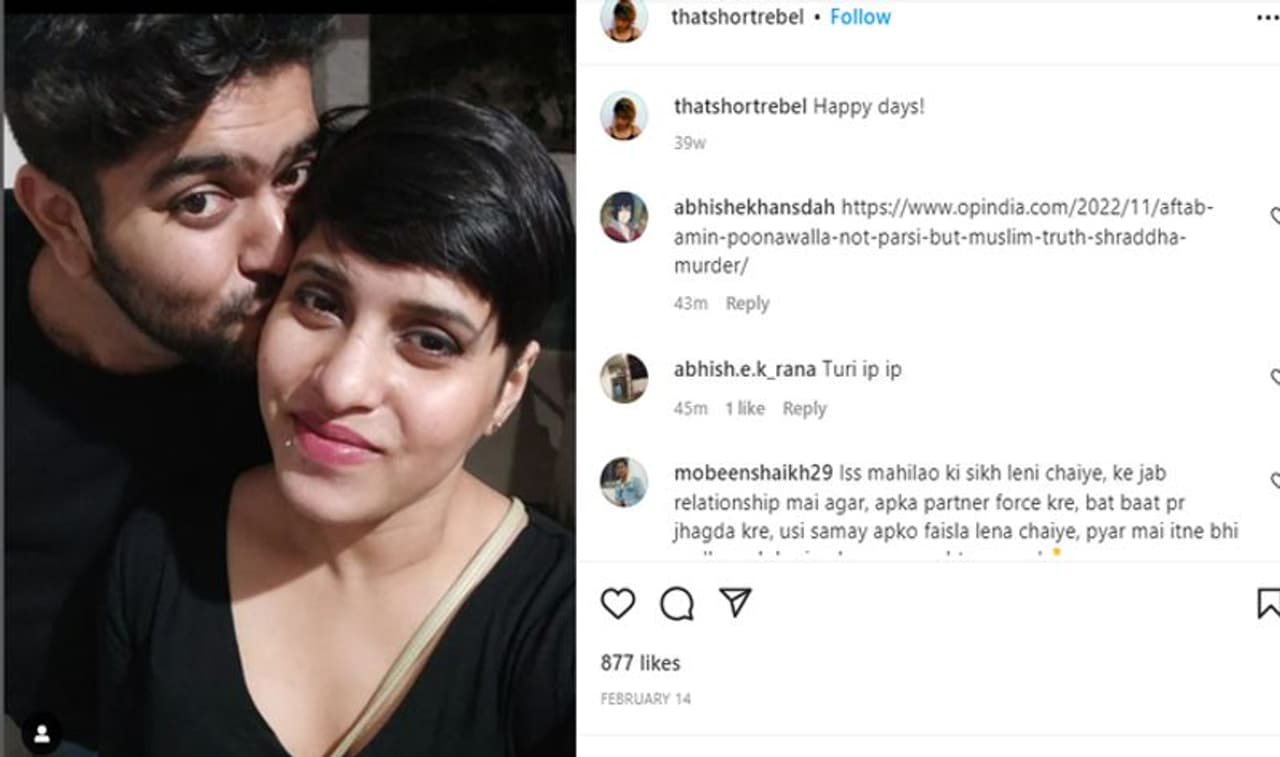 इससे काफी वक्त पहले उसने अपने लिव इन पार्टनर के साथ एक तस्वीर पोस्ट की दी। जिसका कैप्शन उसने ''हैप्पी डेज''दिया था। इस तस्वीर को उसने वैलेंटाइन डे के मौके पर शेयर की थी।यह इकलौती फोटो थी जिसे उन्होंने आफताब के साथ इंस्टाग्राम पर शेयर किया था। अपने इंस्टाग्राम प्रोफाइल में खुद को एक पथिक यानी wanderer के रूप में डिसक्राइब किया था।