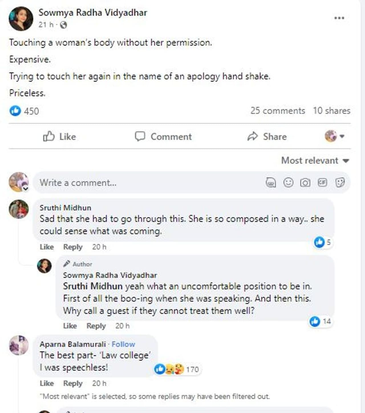 इस बीच खुद अपर्णा बालामुरली ने भी पूरी घटना पर अपना रिएक्शन दिया है। दरअसल, पोएट और राइटर सौम्या राधा विद्यासागर ने फेसबुक पर लिखा था, " एक महिला को उसकी मर्जी के बगैर छूना। महंगा है। माफ़ी के नाम पर हाथ मिलाकर उसे दोबारा छूने की कोशिश प्राइसलेस है।" इस पोस्ट पर रिएक्शन देते हुए अपर्णा ने लिखा है, "और सबसे बड़ी बात...लॉ कॉलेज। मैं निशब्द थी।"