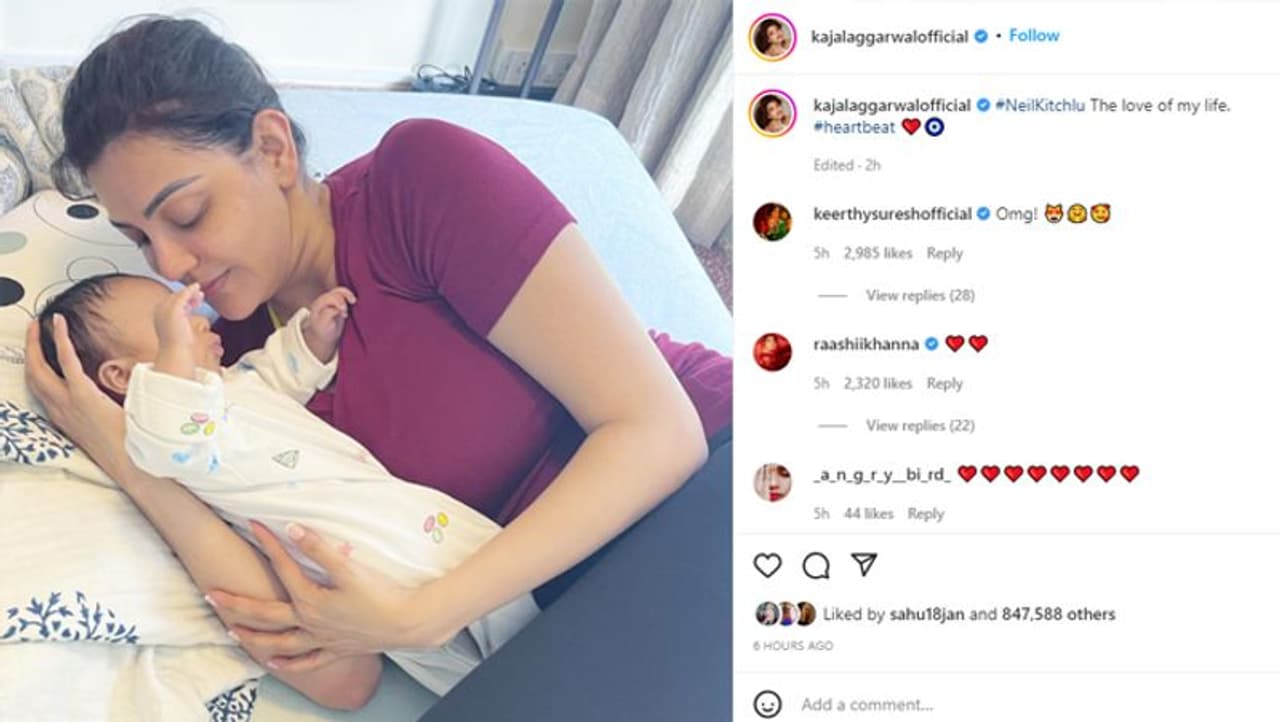 एंटरटेनमेंट डेस्क. साउथ इंडियन और हिंदी सिनेमा की एक्ट्रेस काजल अग्रवाल (Kajal Aggarwal) ने सोशल मीडिया पर पहली बार अपने डेढ़ महीने के बेटे की ऐसी फोटो शेयर की है, जिसमें कुछ हद तक उसका चेहरा दिखाई दे रहा है। काजल ने फोटो के कैप्शन में लिखा है, "नील किचलू, द लव ऑफ़ माय लाइफ (The love of my life)". फोटो देखने के बाद काजल के फ्रेंड्स और इंडस्ट्री के कलीग्स बेटे पर ख़ूब प्यार लुटा रहे हैं। मसलन एक्ट्रेस कीर्ति सुरेश ने कमेंट बॉक्स में लिखा है, "Omg".एक्ट्रेस राशि खन्ना ने डबल हार्ट की इमोजी शेयर की हैं। काजल के प्रशंसक भी तरह-तरह की इमोजी शेयर कर उनके बेटे के प्रति अपना प्यार दिखा रहे हैं।