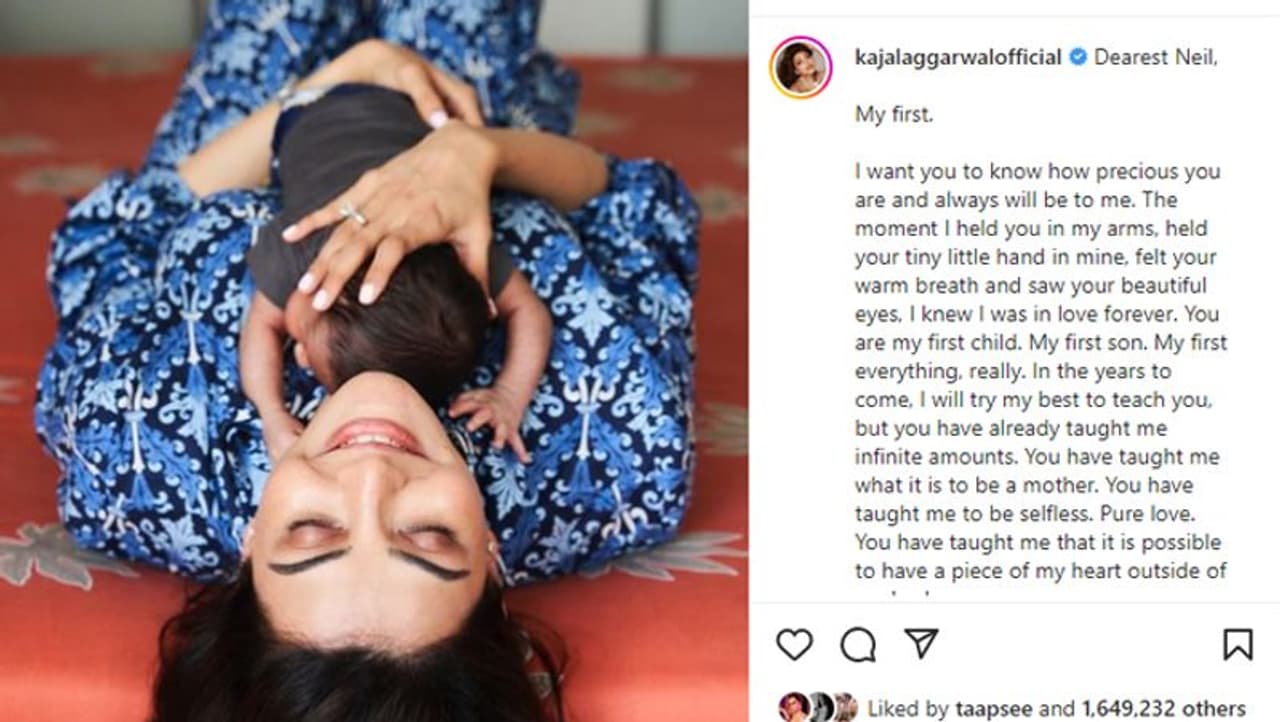 काजल ने इससे पहले बेटे की पहली झलक 8 मई को तब शेयर की थी, जब वह सिर्फ 18 दिन का था। उन्होंने इसके साथ लंबी सी पोस्ट में अपनी भावनाएं साझा की थीं। काजल ने लिखा था, "मैं चाहती हूं कि तुम्हे पता चले कि तुम मेरे लिए कितने कीमती हो और हमेशा रहोगे। जिस पल मैंने तुम्हे बाहों में लिया, तुम्हारा नन्हा सा हाथ हाथों में लिया, तुम्हारी गर्म सांसें महसूस की और तुम्हारी आंखों में देखा तो मुझे पता था कि मैं हमेशा के लिए तुम्हारे प्यार में पड़ गई थी। तुम मेरी पहली संतान हो, मेरे पहले बेटे हो। हकीकत में मेरा सब कुछ पहला तुम ही हो। आने वाले सालों में मैं तुम्हे बहुत कुछ सिखाने की कोशिश करूंगी। तुमने पहले ही मुझे बहुत कुछ सिखा दिया है। तुमने मुझे समझा दिया है कि मां क्या होती है? निस्वार्थ होना क्या होता है? तुमने मुझे शुद्ध प्रेम सिखाया। तुमने मुझे यह बताया कि अपने शरीर के बाहर अपने कलेजे का टुकड़ा हो सकता है। यह जितनी डरावनी बात है, उससे ज्यादा खूबसूरत है। अभी मुझे बहुत कुछ सीखना है। जिसके कारण मुझे यह पहला अनुभव हुआ, वह होने के लिए तुम्हारा शुक्रिया। ऐसा किसी और ने नहीं किया। मेरे छोटे राजकुमार भगवान ने तुम्हे मेरे लिए चुना है। मेरी दुआ है कि तुम मजबूत और मधुर बनों और हमेशा औरों के दिलों में रहो। मेरी दुआ है कि इस दुनिया में तुम्हारा व्यक्तित्व कभी धुंधला न हो। हमेशा उज्जवल रहे। मेरी दुआ है कि तुम हमेशा दयालु, उदार और धैर्यवान हों। मैं तुममें पहले से ही बहुत कुछ देख रही हूं। मुझे तुम्हे अपना कहने में गर्व महसूस होता है। तुम मेरे सूरज, चंदा, तारे और नन्हे-मुन्ने प्यारे हो। यह कभी मत भूलना।"
