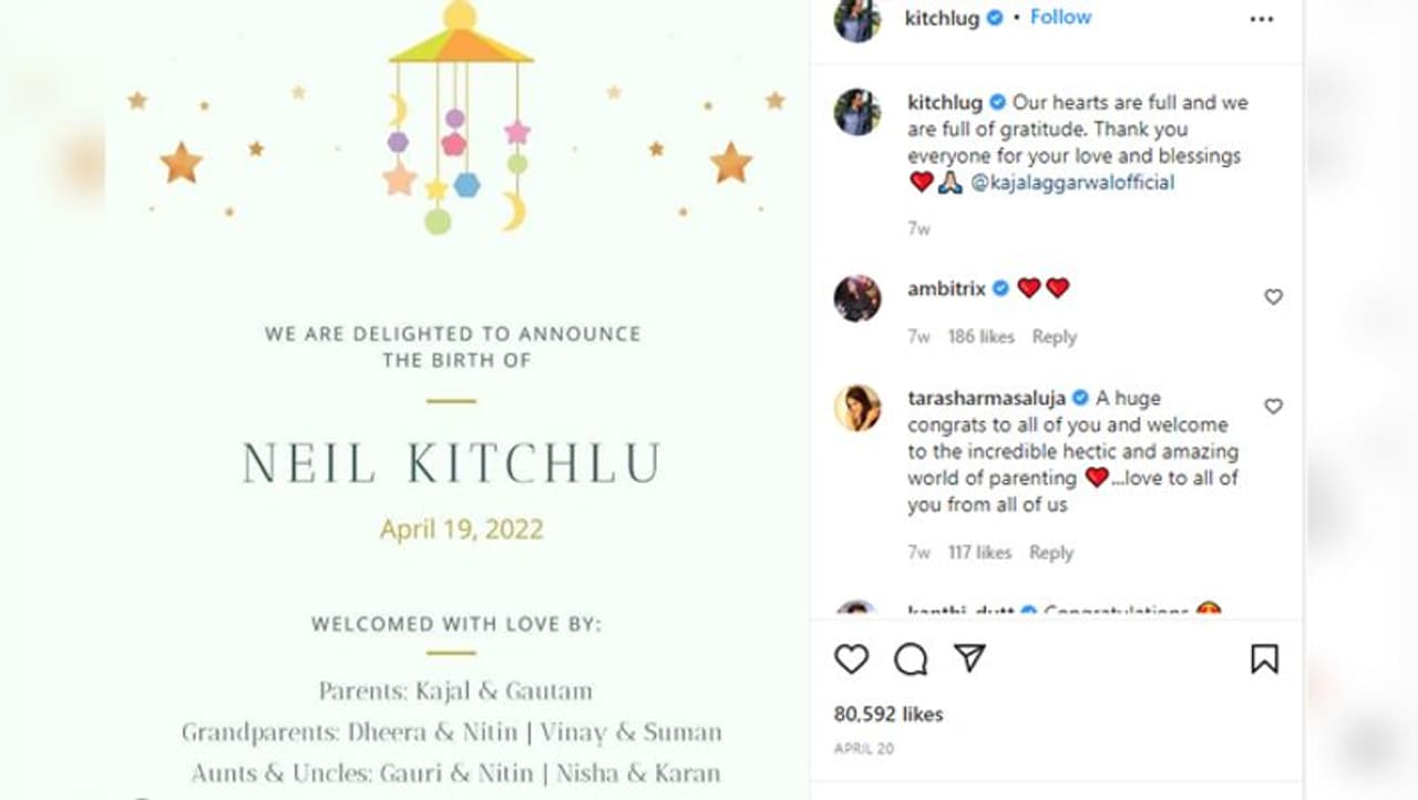 काजल अग्रवाल ने इसी साल 19 अप्रैल को बेटे को जन्म दिया था। उनके पति बिजनेसमैन गौतम किचलू ने सोशल मीडिया पर एक पोस्ट के जरिए इसका अनाउंसमेंट किया था। गौतम ने एक फोटो शेयर की थी, जिसमें लिखा हुआ था, "हमें 19 अप्रैल 2022 को नील किचलू के जन्म की घोषणा करते हुए बेहद ख़ुशी हो रही है।" इसके नीचे गौतम ने बच्चे का स्वागत करने वालों में पैरेंट्स के रूप में काजल और अपना, दादा-दादी, नाना-नानी, चाचा-चाची और मामा-मामी तक नाम लिखा था।" फोटो के कैप्शन में गौतम ने लिखा था, "हमारे दिल भरे हुए हैं और कृतज्ञता से पूर्ण हैं। आपके प्यार और आशीर्वाद के लिए बहुत-बहुत धन्यवाद।"