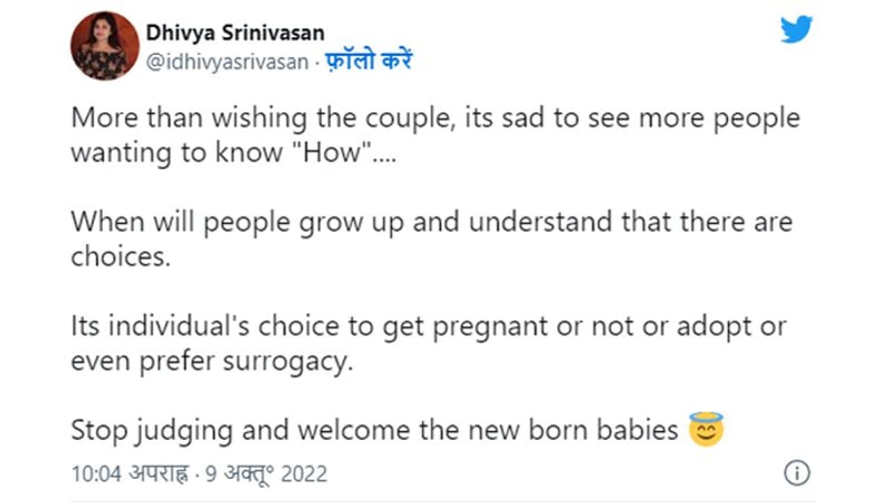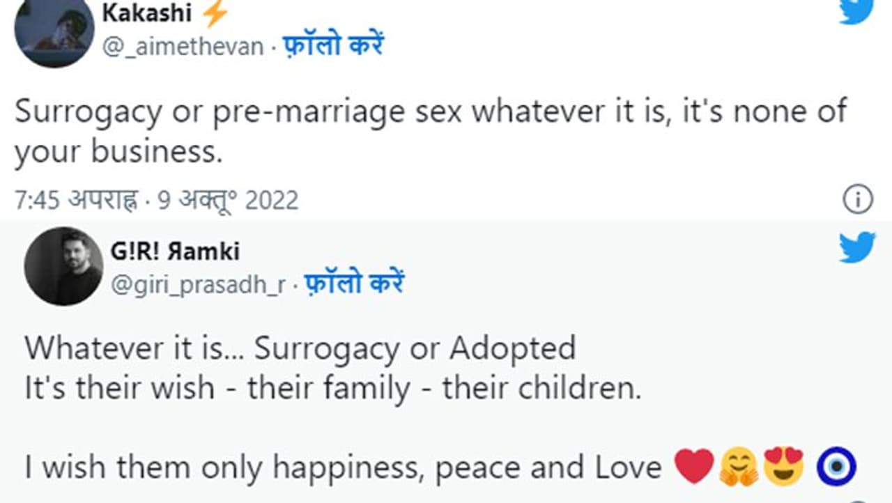 एक यूजर ने लिखा है, "यह देखना दुखद है कि कपल को बधाई देने की बजाय ज्यादातर लोग यह जानना चाहते हैं कि कैसे? लोग कब बड़े होंगे और समझेंगे कि यह उनकी चॉइस है। यह किसी की निजी चॉइस है कि प्रेग्नेंट होना है, अडॉप्ट करना है या फिर सेरोगेसी से करना है। जज करना बंद करें और नवजातों का स्वागत करें।"