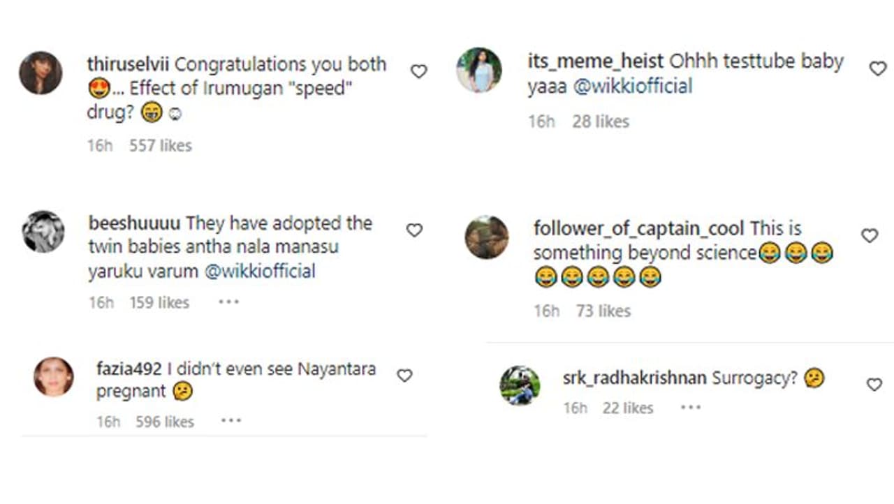विग्नेश की पोस्ट देखने के बाद एक इंटरनेट यूजर ने कमेंट किया है, "यह साइंस से भी आगे की चीज है।" एक यूजर ने पूछा है, "सेरोगेसी?" एक यूजर का कमेंट है, "बहुत तेज।" एक यूजर का कमेंट है, "यह कैसे संभव है?" एक यूजर का कमेंट है, "उन्होंने बच्चों को गोद लिया है।" एक यूजर ने मजे लेते हुए लिखा है, "बधाई हो दोनों को। इरुमुगन स्पीड ड्रग का असर।"