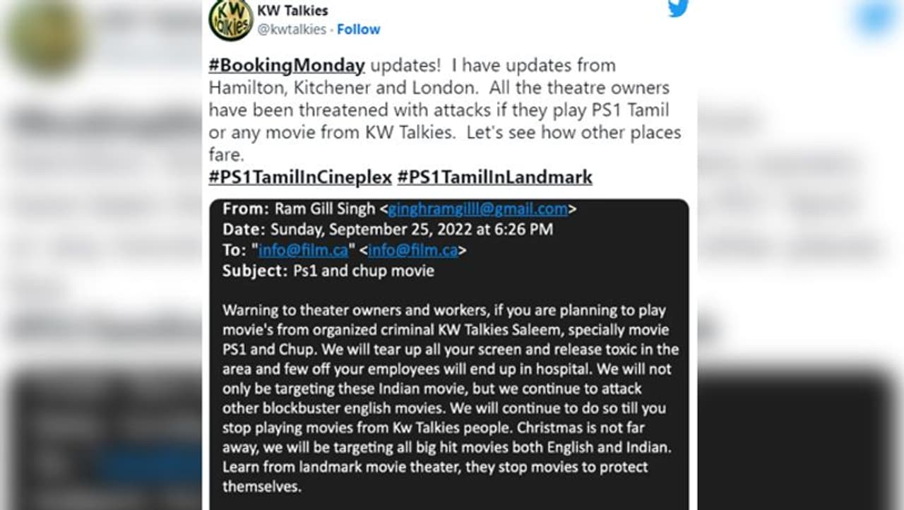 कनाडा में 'पोन्नियिन सेल्वन' के ओवरसीज डिस्ट्रीब्यूटर केडब्ल्यू टॉकीज ने ट्विटर पर धमकी भरे ईमेल का स्क्रीन शॉट साझा किया है। इसके कैप्शन में उन्होंने लिखा है, "मेरे पास हैमिलटन, किचनर और लंदन से अपडेट हैं। सभी थिएटर मालिकों को धमकी दी गई है कि अगर वे 'PS1' तमिल या केडब्ल्यू टॉकीज की को फिल्म चलाते हैं तो वहां हमले किए जाएंगे। आइए देखें कि दूसरी जगहों का हाल कैसा है।"