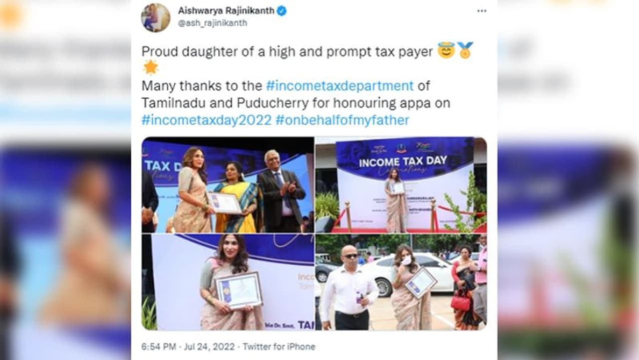 तस्वीरों में ऐश्वर्या रजनीकांत का सम्मान पत्र प्राप्त करती और उसके साथ पोज देती दिखाई दे रही हैं। उन्होंने कैप्शन में लिखा है, "एक हाई और सबसे जल्दी टैक्स भरने वाले की गर्वित बेटी। इनकम टैक्स दिवस पर अप्पा को सम्मानित करने के लिए तमिलनाडु और पुडुचेरी के इनकम टैक्स डिपार्टमेंट का बहुत-बहुत शुक्रिया।" इसके साथ उन्होंने बताया है कि अप्पा की ओर से यह सम्मान उन्होंने रिसीव किया है। इस इवेंट में तेलंगाना की राज्यपाल और पुडुचेरी की लेफ्टिनेंट गवर्नर डॉ. तमिलसाई सुंदरराजन मुख्य अतिथि के रूप में मौजूद थीं।