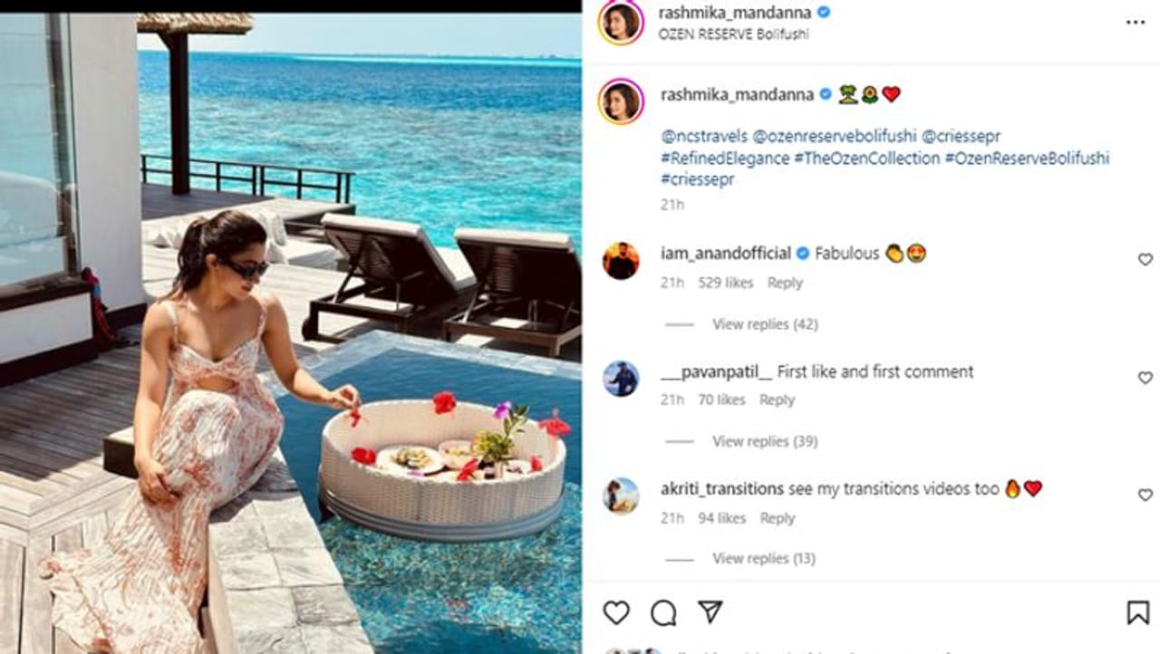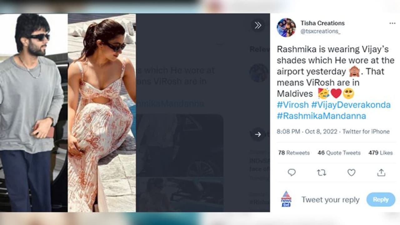 एक इंटरनेट यूजर ने रश्मिका और विजय की तस्वीर साझा करते हुए लिखा है, "रश्मिका ने विजय का वह सनग्लास पहना है, जो वे कल एयरपोर्ट पर पहने दिखाई दिए थे। इसका मतलब है कि ViRosh (विजय और रश्मिका) मालदीव में हैं।" एक अन्य यूजर ने लिखा है, "रश्मिका मंदाना आपने विजय देवरकोंडा के सनग्लासेस पहने हैं। देखो, हम सभी फैन्स आप दोनों के लिए खुश हैं। इसलिए छुपाने की जरूरत नहीं है माय लव।"