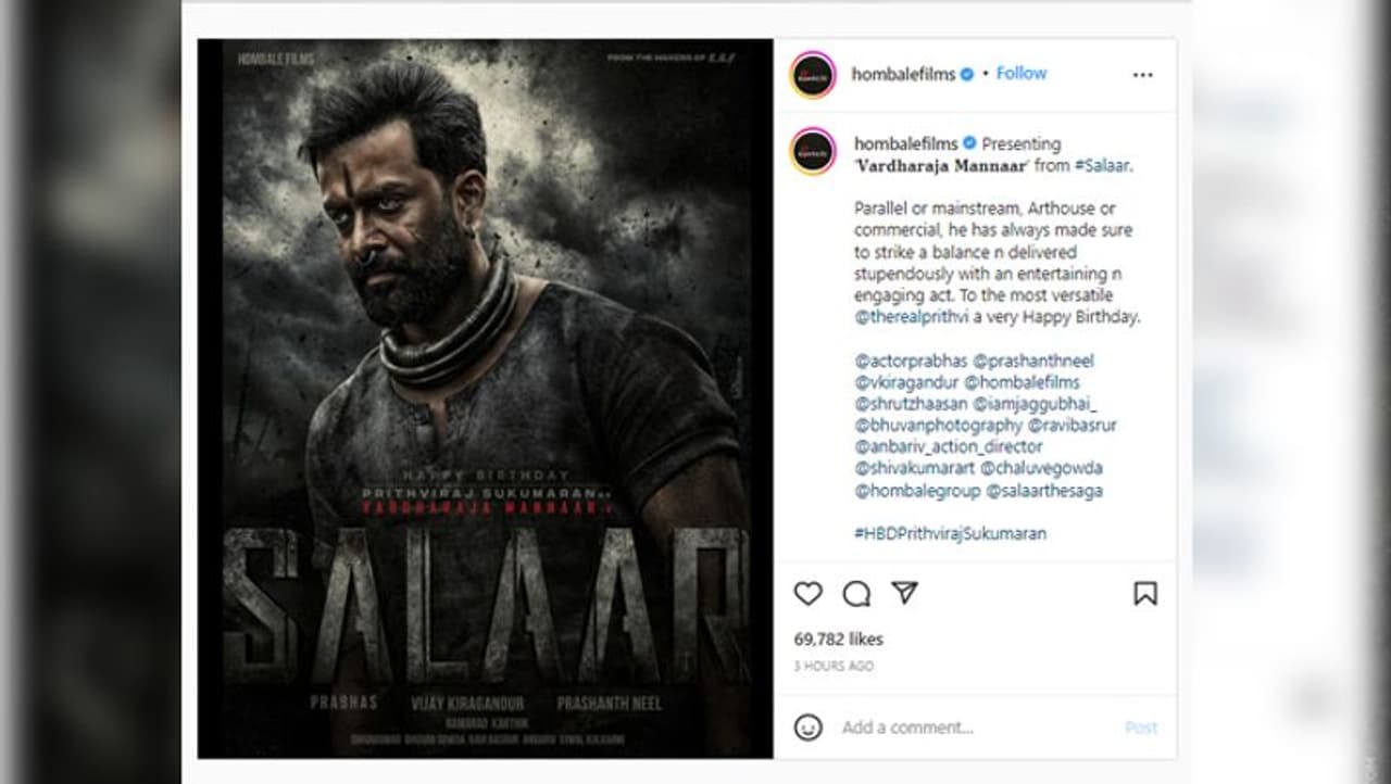 प्रोडक्शन हाउस ने पोस्टर शेयर करते हुए सोशल मीडिया पर लिखा है, "सालार से वर्धाराजा। पैरलल, मेनस्ट्रीम, आर्टहाउस या कमर्शियल, उन्होंने हमेशा मनोरंजक और आकर्षक एक्टिंग के साथ संतुलन बनाए रखना सुनिश्चित किया है। सबसे बहुमुखी प्रतिभा वाले एक्टर पृथ्वीराज सुकुमारन को जन्मदिन की हार्दिक शुभकामनाएं।"