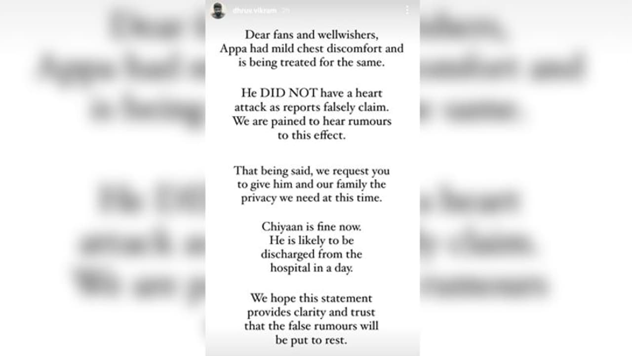 विक्रम के परिजनों ने स्टेटमेंट में लिखा है, "प्रिय प्रशंसकों और शुभचिंतकों, अप्पा को सीने में हल्की तकलीफ थी, जिसका इलाज किया जा रहा है। उन्हें दिल का दौरा पड़ने की ख़बरें बिल्कुल झूठी हैं। हमें ये ख़बरें पढ़कर दुःख हुआ। आपसे अनुरोध है कि उन्हें और हमें प्राइवेसी दें, जिसकी हमें इस वक्त जरूरत है। चियान अब ठीक हैं। एक ही दिन में उन्हें अस्पताल से छुट्टी मिलने की संभावना है। हमें उम्मीद है कि हमारा यह बयान स्थिति स्पष्ट करेगा और झूठी अफवाहों पर विराम लगाएगा।"