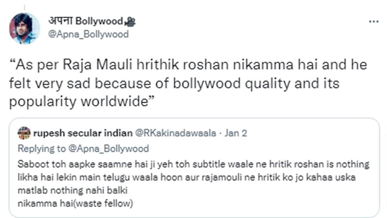 इसी ट्वीट में आगे लिखा है, "राजामौली के मुताबिक़, ऋतिक रोशन निकम्मा है और उन्हें बॉलीवुड की क्वालिटी और दुनियाभर में इसकी लोकप्रियता से दुख हुआ।"