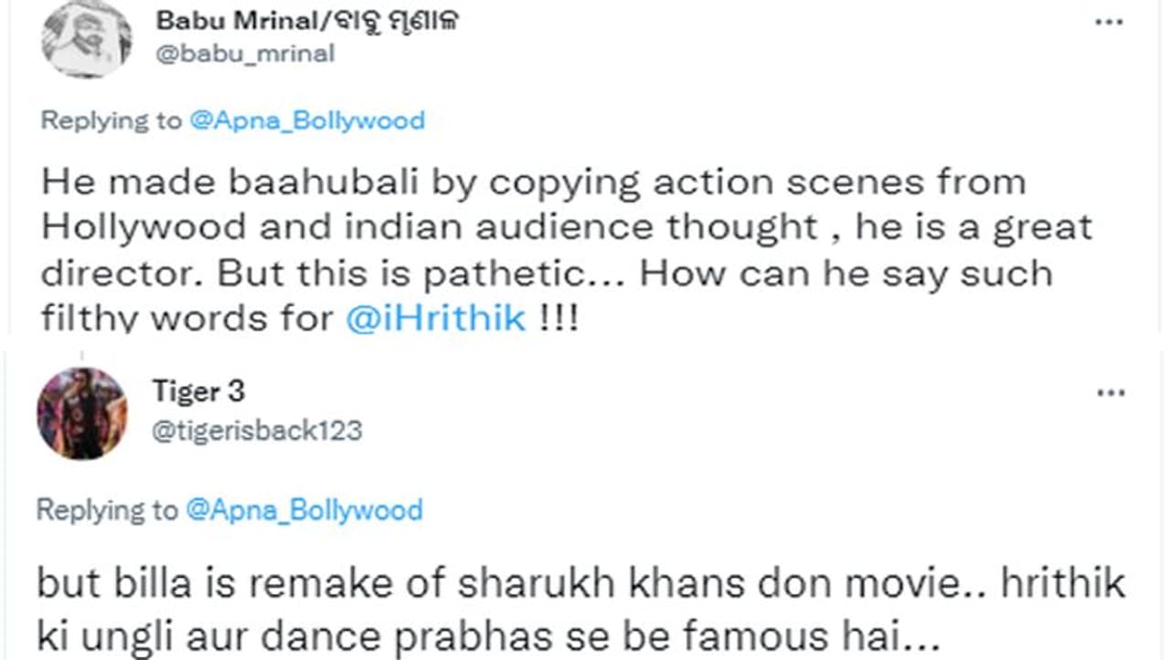 वीडियो पर भड़कते हुए ऋतिक रोशन के एक फैन ने लिखा है, "उन्होंने हॉलीवुड के सीन कॉपी कर बाहुबली बनाई और इंडियन ऑडियंस सोचते हैं कि वे महान डायरेक्टर हैं। लेकिन यह दयनीय है। वे ऋतिक रोशन के लिए इतने गंदे शब्द कैसे कह सकते हैं।"