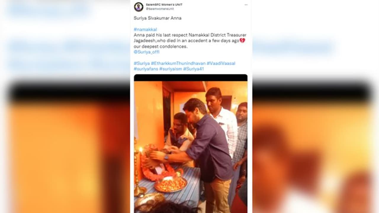 सूर्या की इस विजिट की फोटो उनके एक फैन पेज से शेयर की गई है। इसमें लिखा है, "सूर्या शिवकुमार अन्ना। अन्ना ने नमक्कल जिले के ट्रीजुरेर जगदीश को श्रद्धांजलि दी, जिनका कुछ दिन पहले सड़क दुर्घटना में निधन हो गया था। हमारी गहरी संवेदनाएं।"